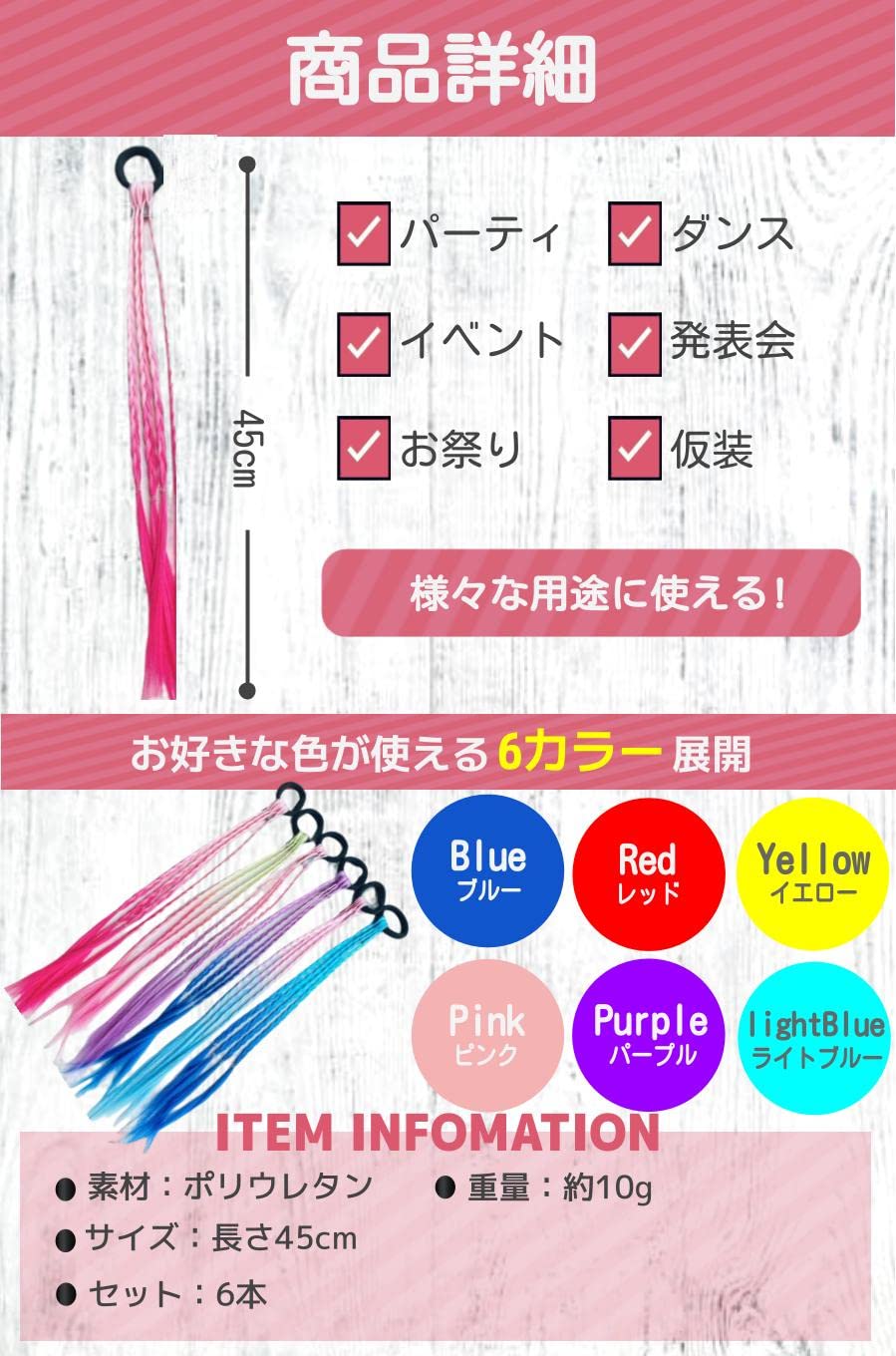 【商品特徴】 グラデーションカラー:華やかでお洒落なグラデーション 太めのゴムを使用:太めのゴムだから地毛に絡みにくい アレンジ自由:6本セットだから組み合わせ自由に楽しめる 上質でリアルな素材:合成繊維を使用しており地毛にも馴染む