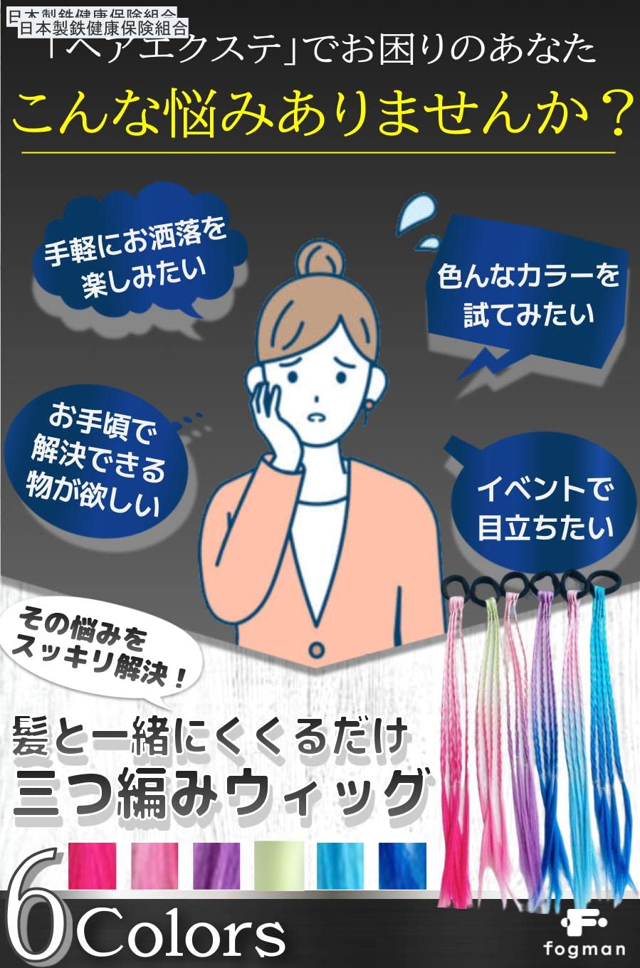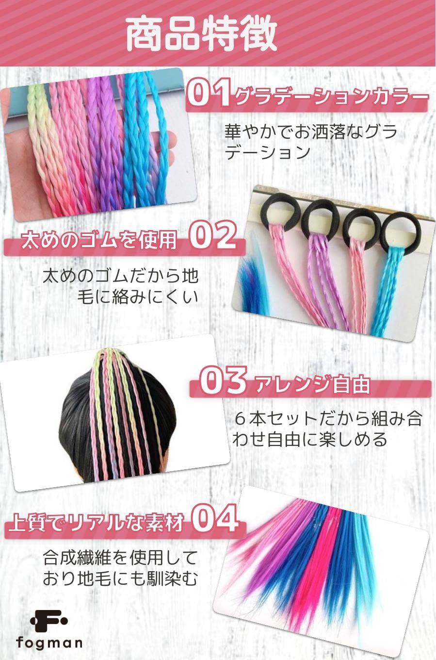 fogman エクステ 編み込み 三つ編み ウィッグ 髪 カラフル 赤 青 ピンク 紫 装着簡単 6色セット