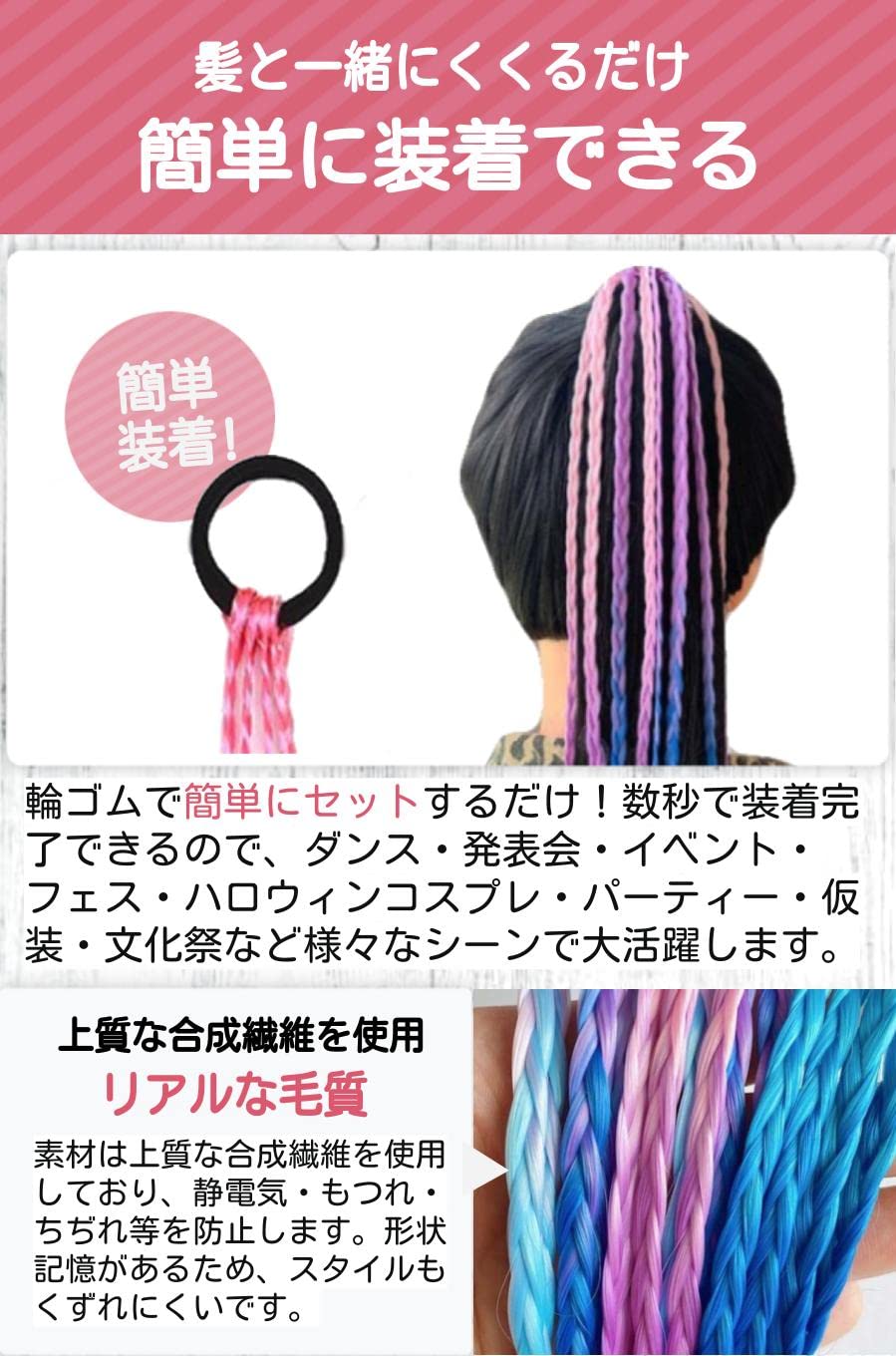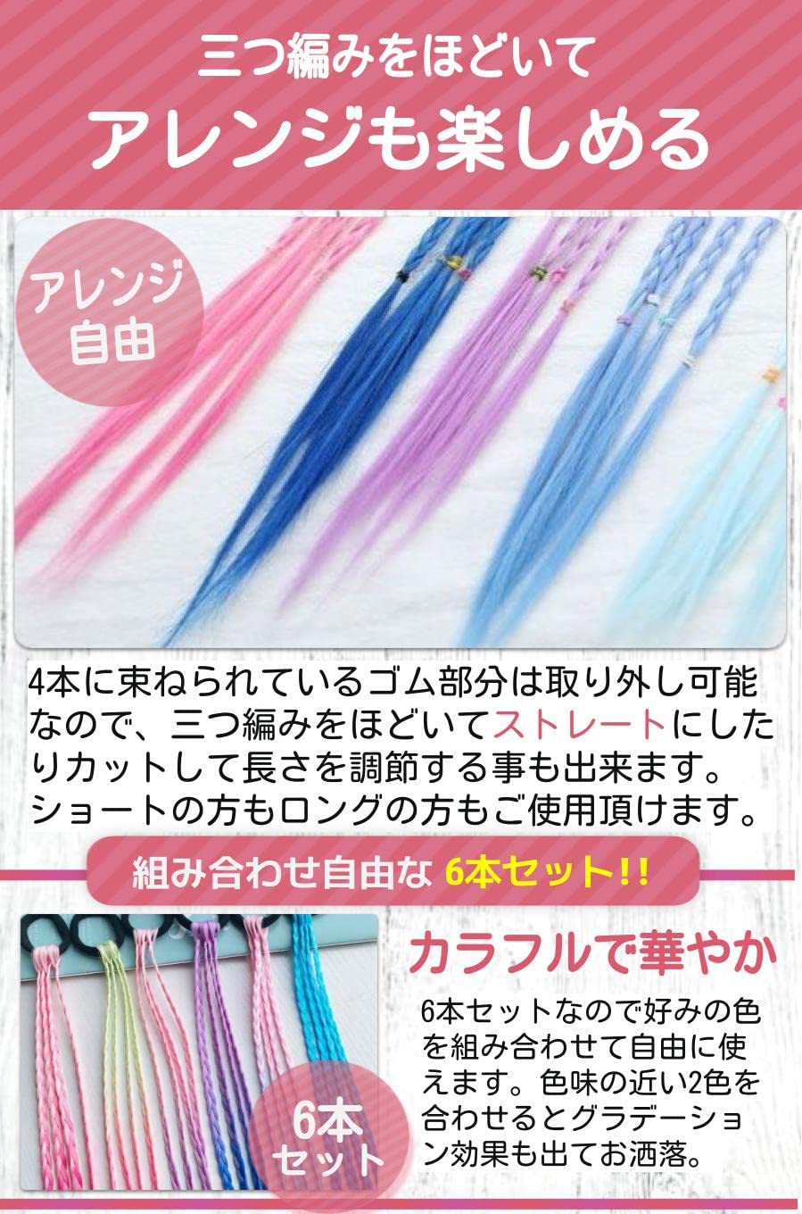 【アレンジも楽しめる】 4本に束ねられているゴム部分は取り外し可能なので、三つ編みをほどいてストレートにしたりカットして長さを調節する事も出来ます。ショートの方もロングの方もご使用頂けます。