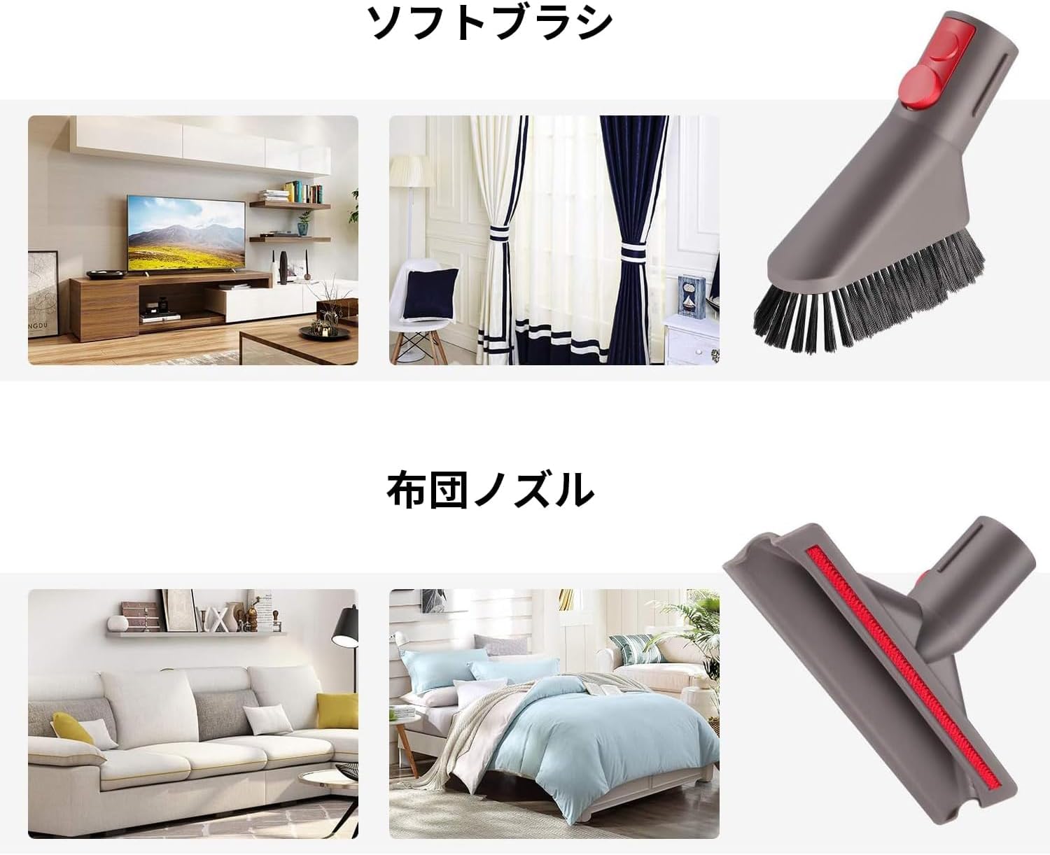 【セット内容】:1 x延長ホース、1 x布団ノズル、1 x隙間ノズル、1 xハードブラシ、1 xソフトブラシ、1 xコンビネーションノズル(ダイソン非純正部品)