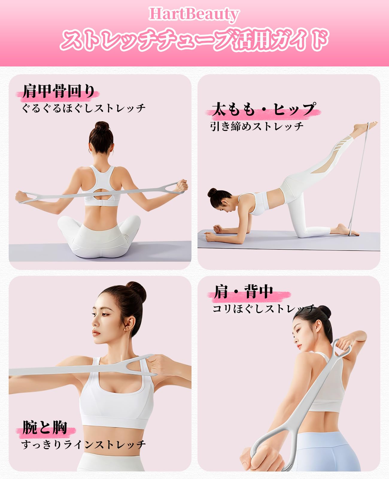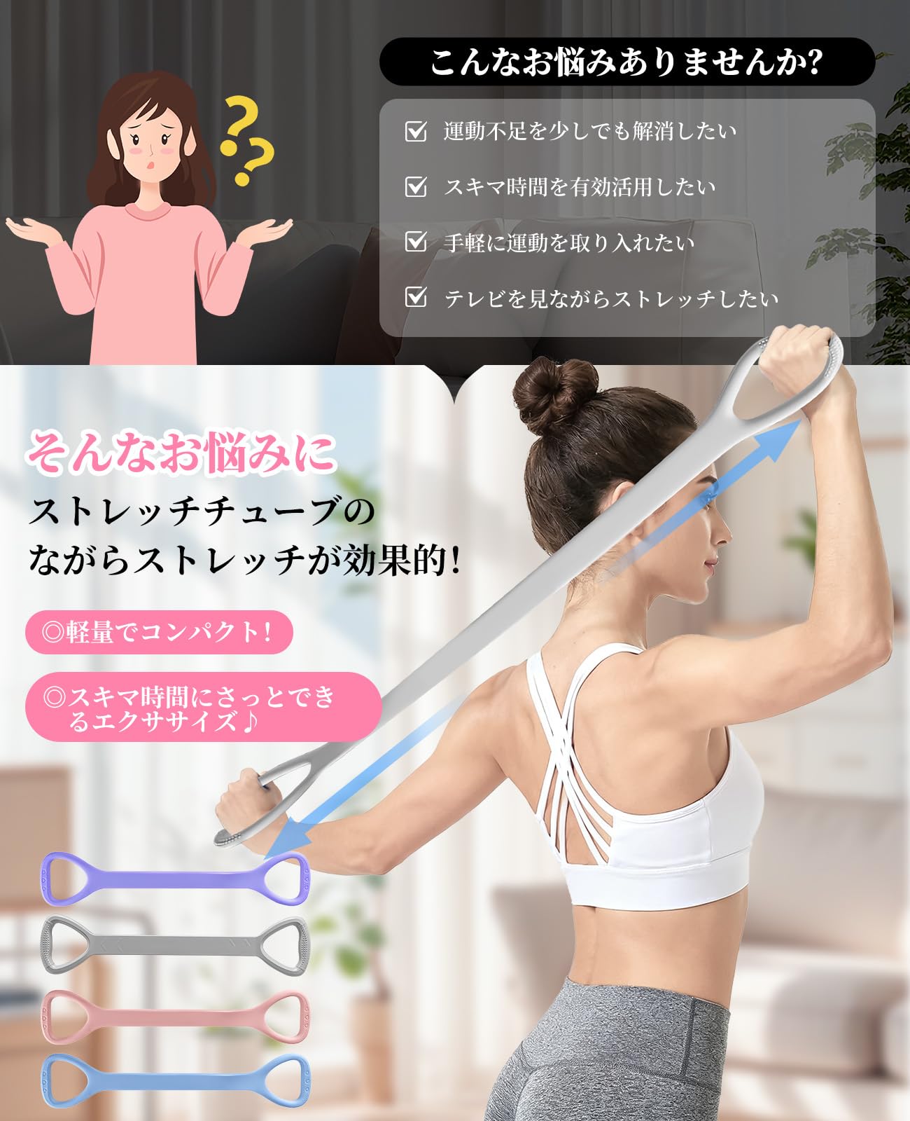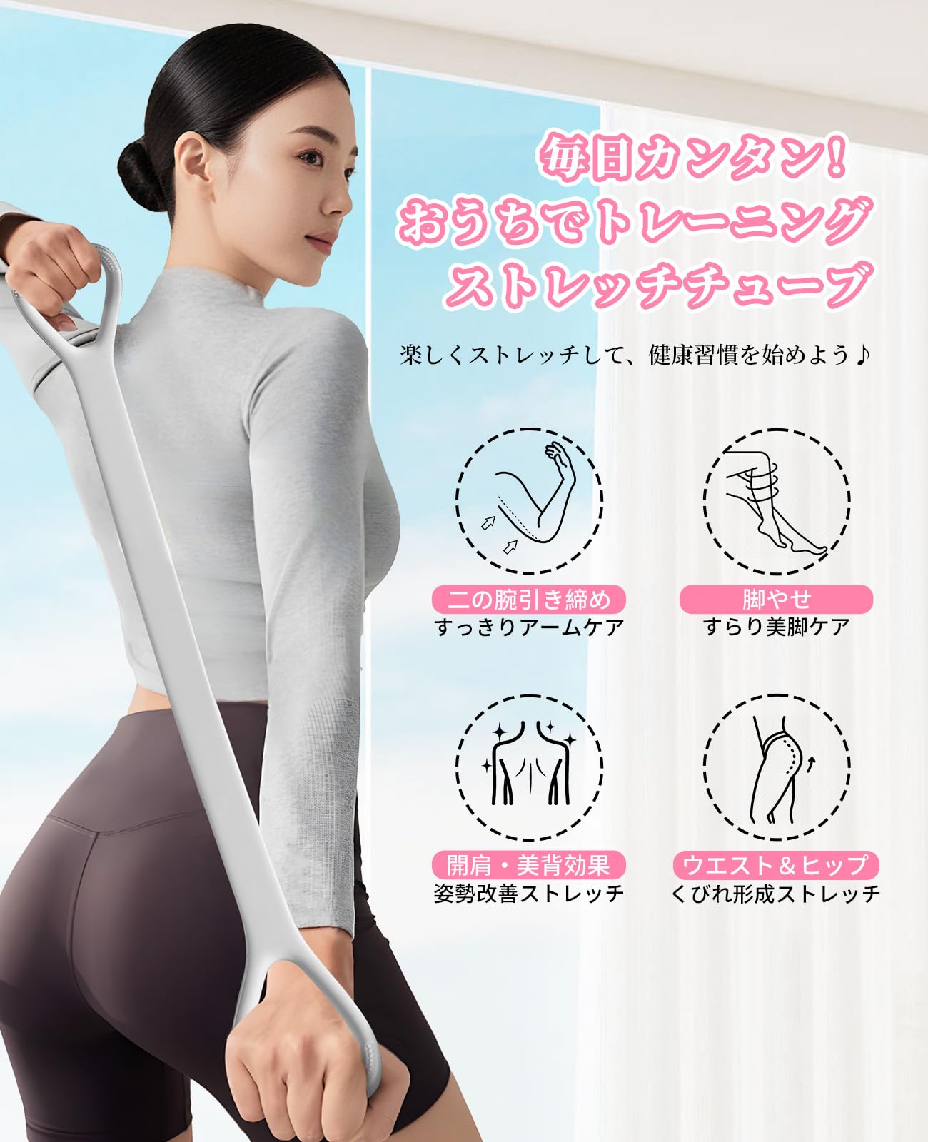 【便利なストレッチチューブ】自宅で手軽にストレッチできる、使いやすいストレッチチューブです。ヨガ、ピラティスはもちろん、日常のストレッチまで、様々なシーンで活用できます。