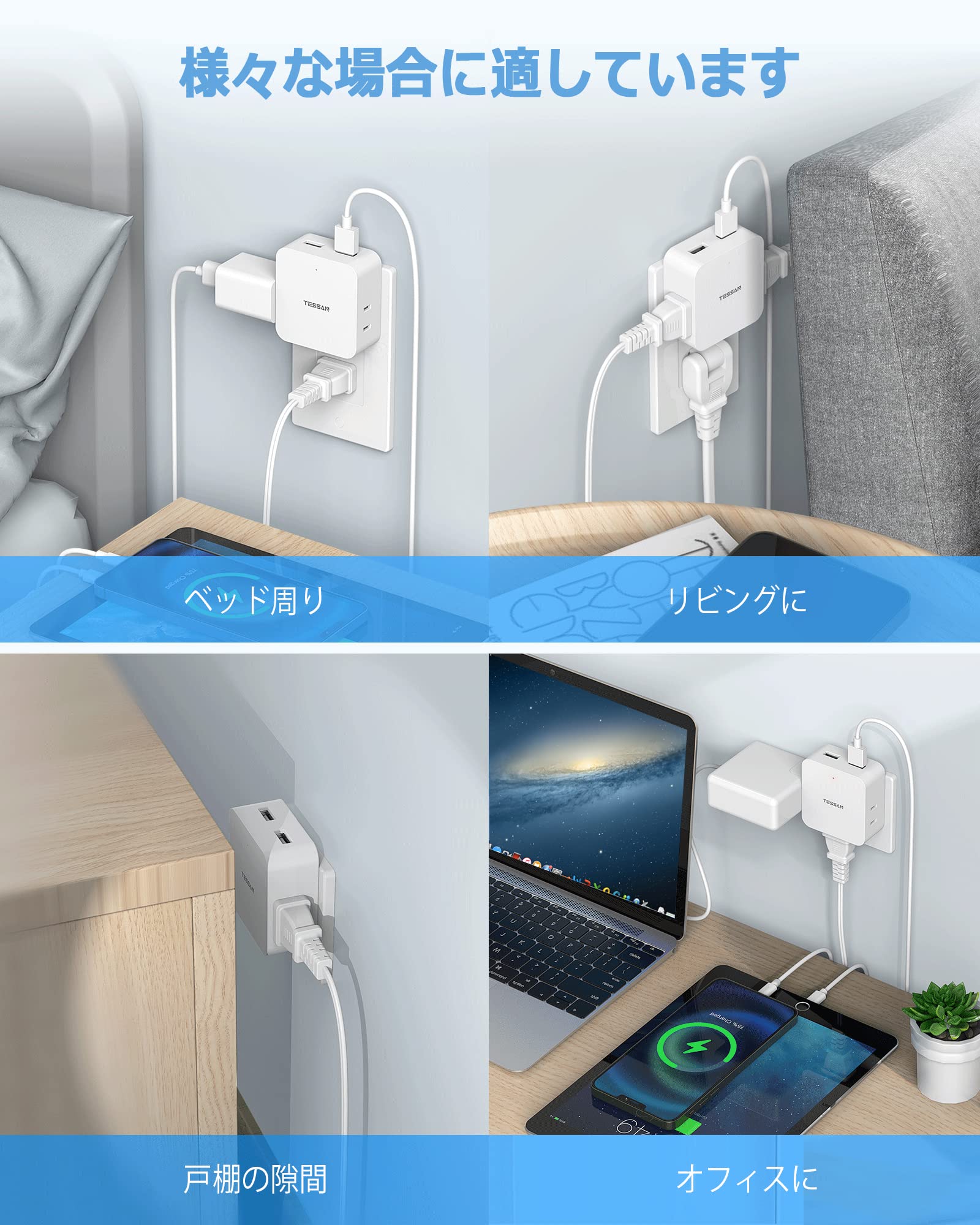 usb コンセント 3口 TESSAN 雷ガード 電源タップ usb 充電器 コーナータップ 3個AC口 2個Type-Aポート たこあし コンセント 薄型 タコ足配線 コンパクト 小型軽量