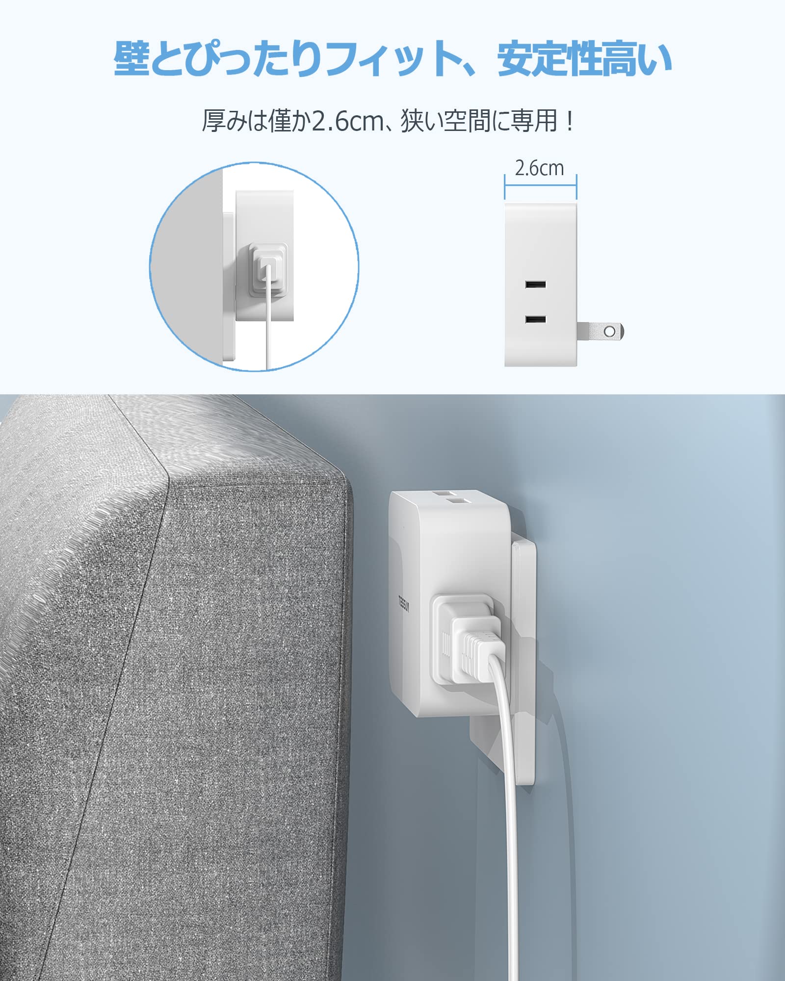 【小型 コーナータップ】上面・下面・両側面で、4方向に電源を分配しています。コンパクトなサイズで、狭い所のコンセント 増設にデザインされています。テレビ裏、ソファー裏やベッドサイドなど狭い空間に最適です。それに、薄いデザインのため、安定性高い直挿しタップとして、壁のコンセントにしっかり挿入できます。