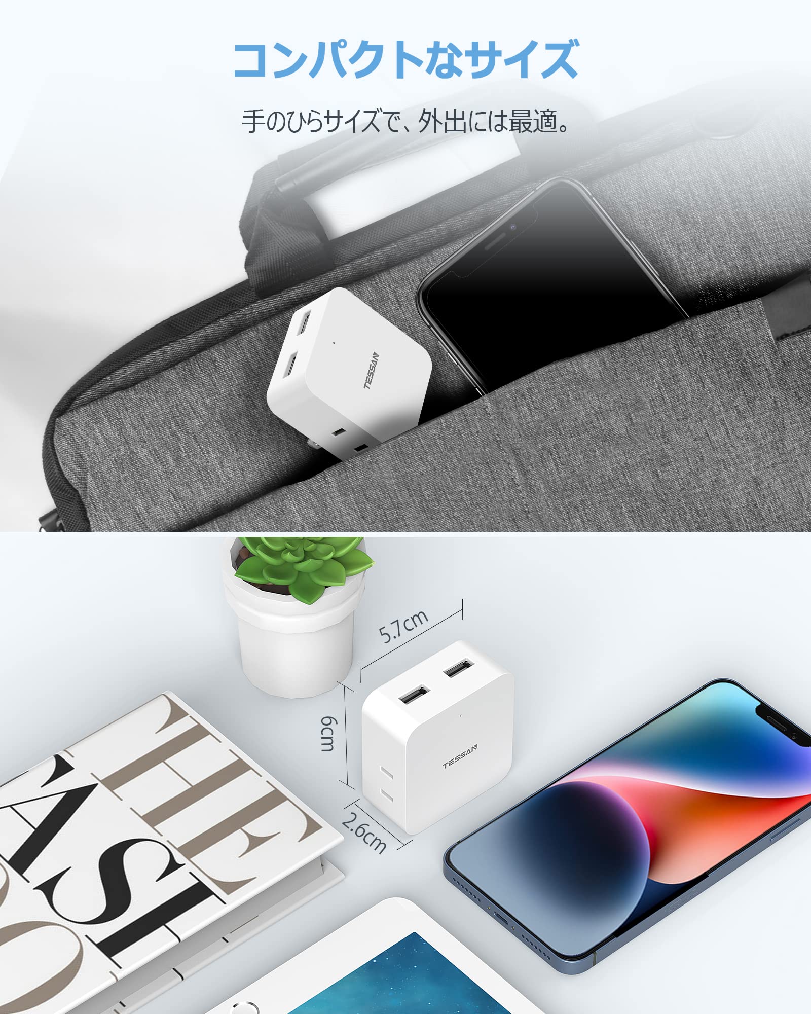 【外出に便利のコンセントタップ】6*5.7*2.6cmのサイズで、手で握れるぐらい小型で、カバンのスペースを占めません。また、約80gの重量で、軽くて、コンパクトのusb 充電器として自宅だけでなく、旅行や出張などの外出際にもご携帯頂けます。