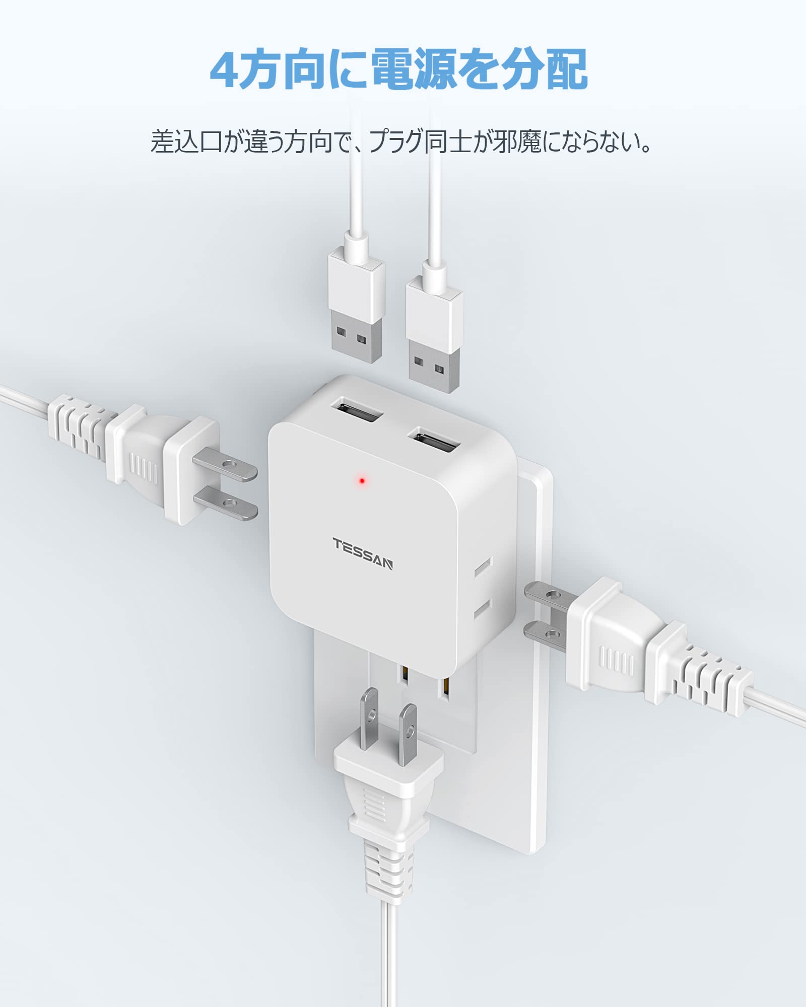 【1台5役 usb付き コンセント】3個のac差込口、2個のusbポートを搭載しているusb タップです。3個のAC口は三つの方向に配置されていて、お互いに干渉せずに、同時使用できます。これ1つのマルチタップで、5台の機器を同時に充電できます。