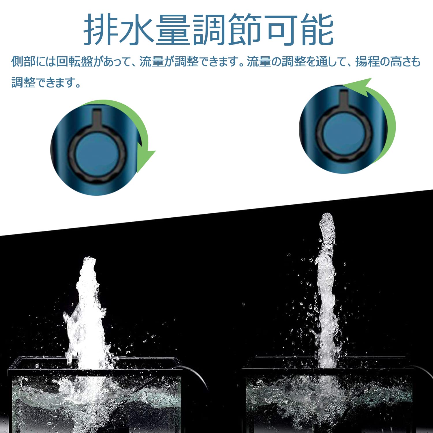 【吐出量調整可能】循環ポンプの正面に流量調整ノッブが付いて、吐出量が最大1500L/Hまで、揚程は1.8Mまで調整できます。流量の調整を通して、揚程の高さも微調整できます。(揚程量は水道管の揚水高さであり、給水ポンプが直接に噴水の高さが大きく違います。)