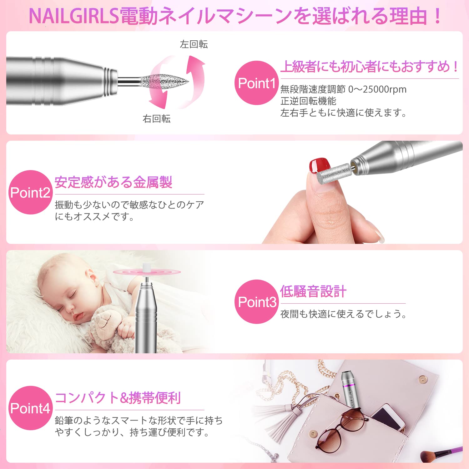 ??【無段階速度調節・正逆回転機能付きでネイル初心者におすすめ】NAILGIRLSプロ仕様の電動ネイルドリルは、 1分間の回転数が0〜25000の無段階速度調整が可能ので、自分の好きなタイミングで少しずつ回転数を上げられます。なお、左右どちらの手で持っても回転方向をあわせることができるため、利き手以外の手でもスムーズに作業ができますよ。
