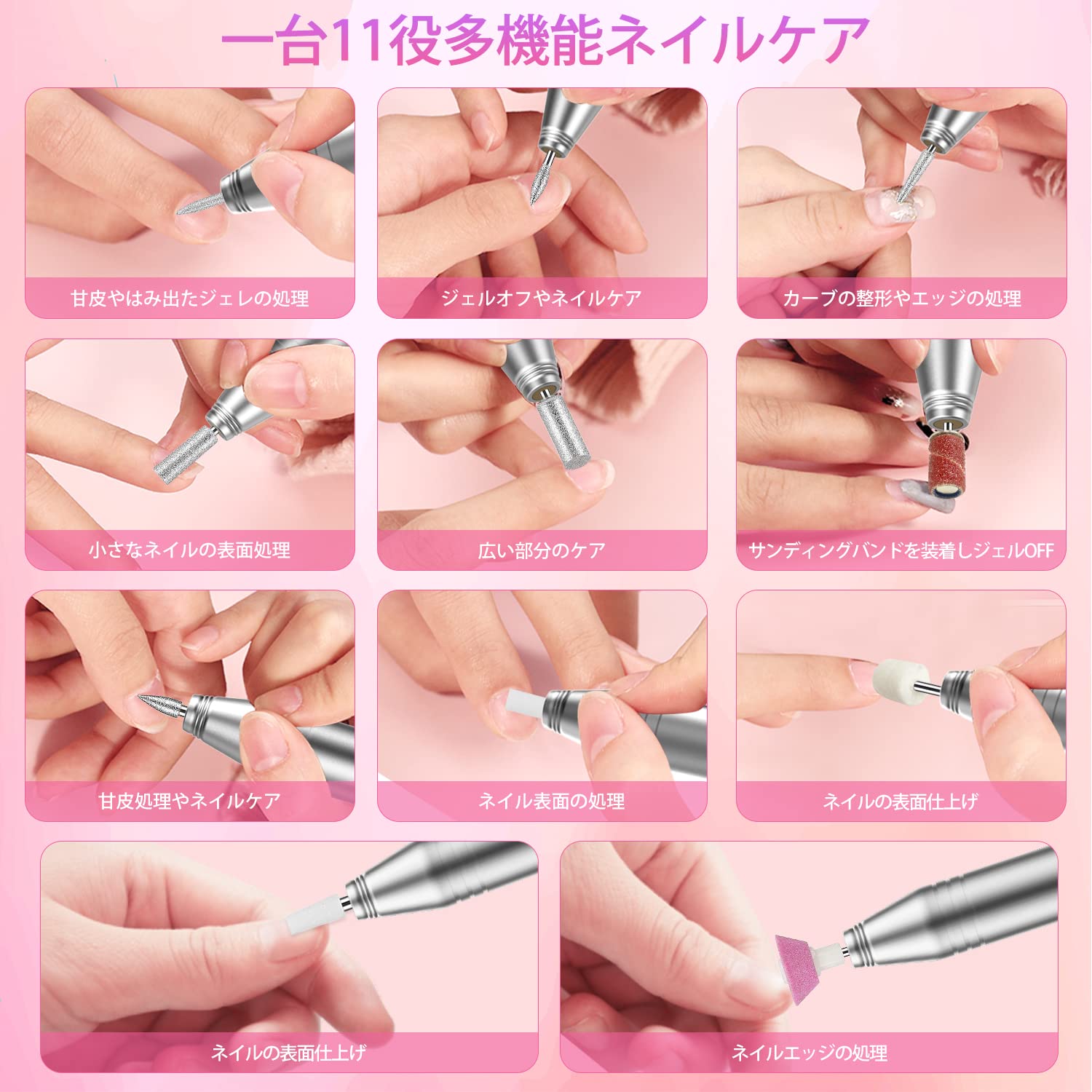 ??【11種類のビット付属で、オフからケアまで可能】 コンパクトなのUSB式タイプで、ネイルアートのオフやジェルネイルのリペアのほか、角質の除去、甘皮処理や爪の整形・爪磨きなど幅広く活用できる11種類のビットが付属しています。ネイルサロンと自宅が愛用することの多いです。