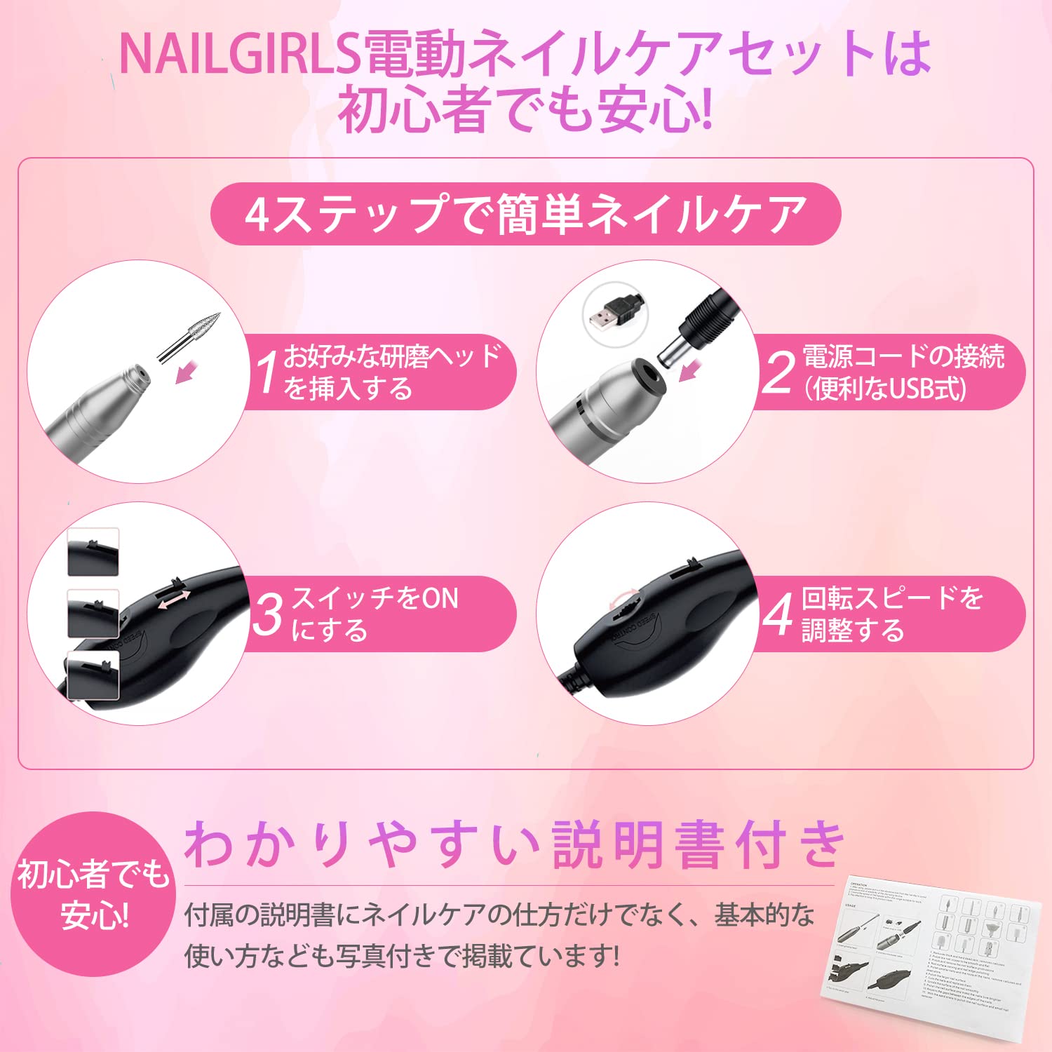 ??【安全で使いやすい】ドリルビットは工具なしで簡単に交換できます。 引き出して差し込むだけです。 USB電源コードを差し込むだけで動作します。ネイルケアは始まります。 ★ご購入日より12ヶ月の付きです。なんの不明点がございましたら、いつでもお気軽にご連絡してください。