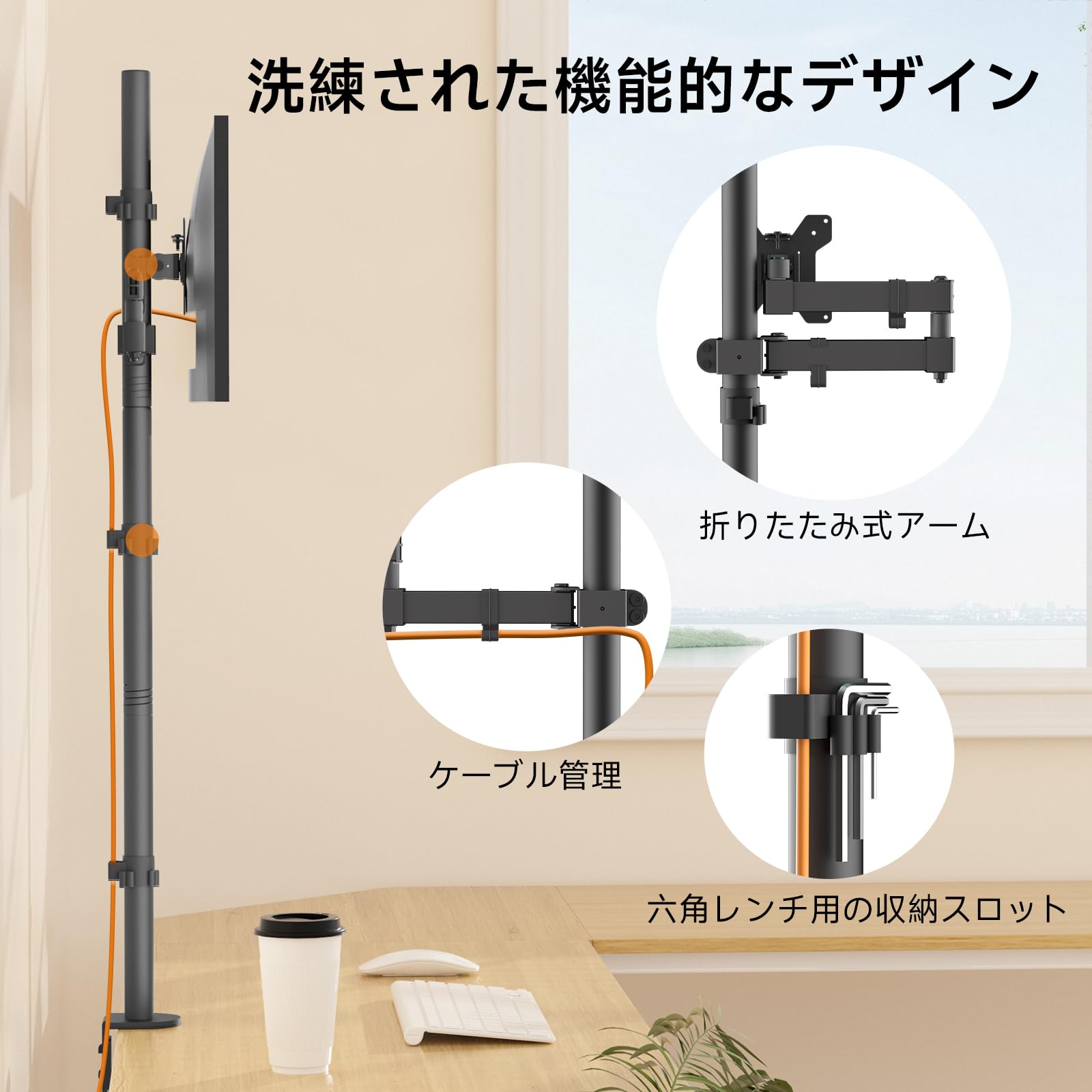 【デスク上のスペースを有効活用】モニターを設置でき、モニターの台座が不要になるため広々とデスク上を使用できます。ケーブル管理で机は清潔で綺麗に整理できます。使わないときはディスプレイアームをたたむことで机上がすっきりします。