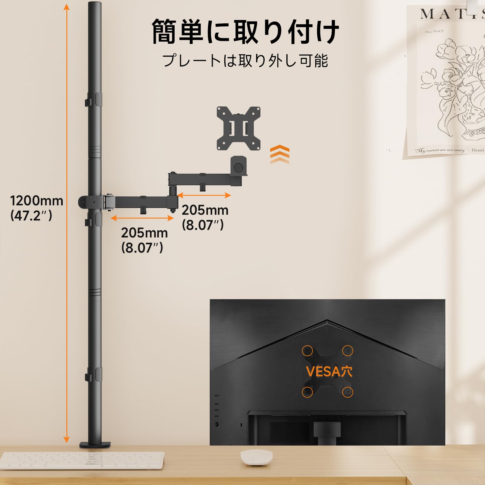 【ディスプレイ角度を自由に変えれる】①アーム:ポールの接続部分移動で高さ調節(1200mm) ②アーム関節部360°③VESAプレート部:上向き80°、下向き80°、回転360°、左右各90°。角度や距離などが自分に合って、前後左右に加えて上下も好みの位置に軽々と動かすことができます。ビジネスでの利用はもちろん、トレーダーやゲーマーの方にもおすすめです。 ご注意:付属の六角レンチでボルトを締めて傾斜角度を固定します。一方のモニターが低い場合は、ナットを取り外し、付属の六角レンチでボルトを反時計回りに回してモニターを上げます。調整後、ナットを取り付けます。