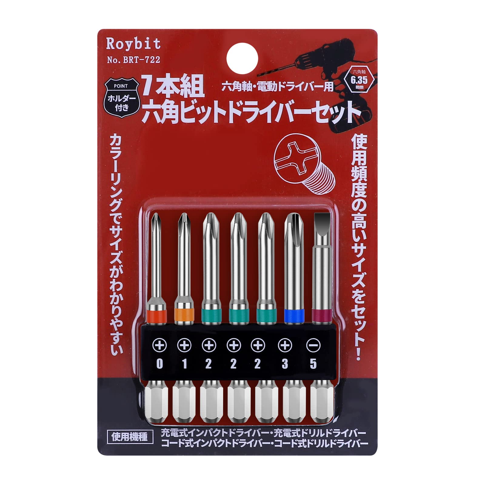 【商品仕様】サイズ:PH0x3mm(1本)、PH1x4mm(1本)、PH2x5mm(3本)、PH3x6mm(1本)、SL5x6mm(1本)。セット内容:7本組。全長さ:65mm。シャンク径:6.35mm。素材:クロムバナジウム鋼。硬度:HCR60±。