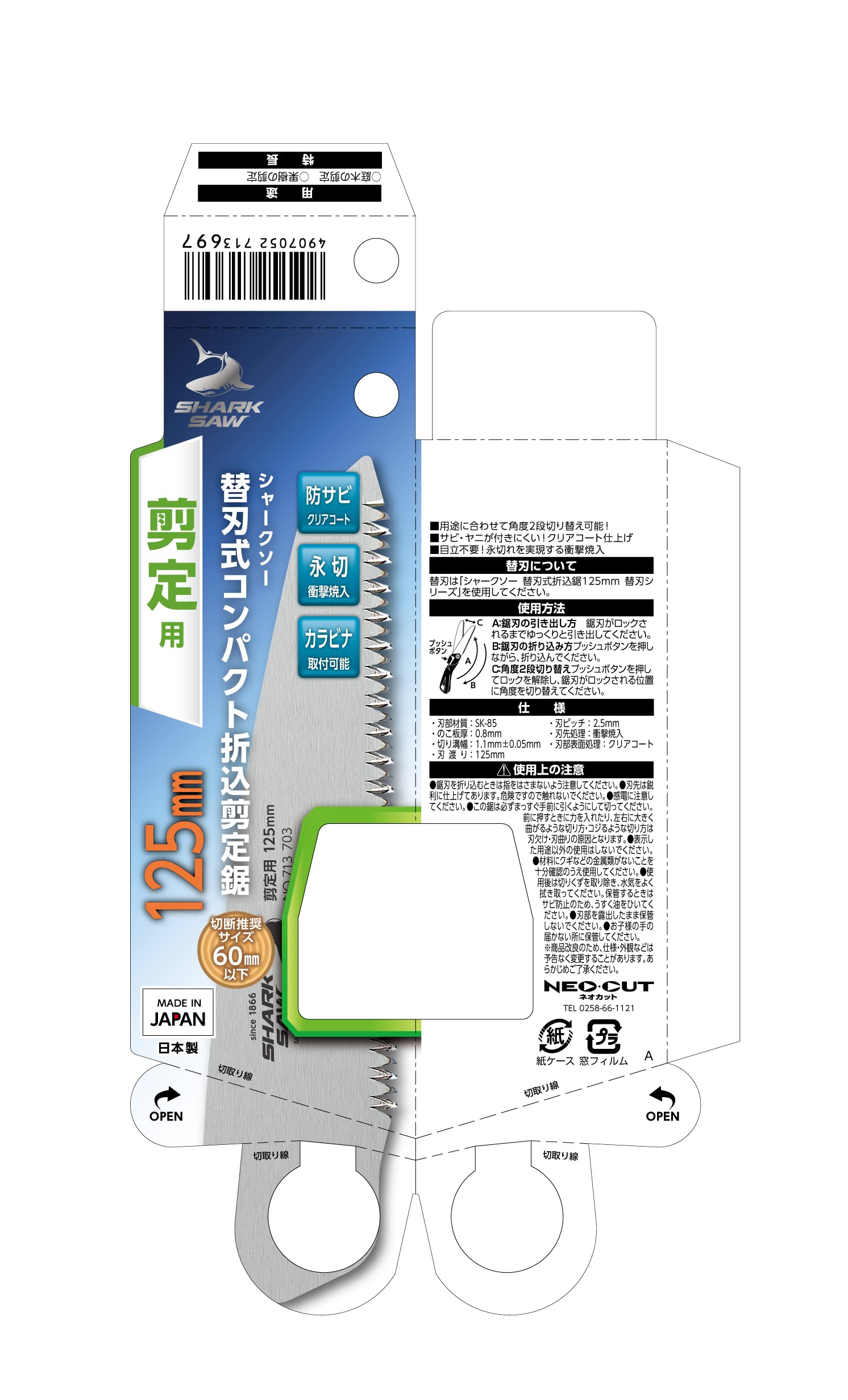 【仕様】刃部材質:SK-85、のこ板厚:0.8mm、切り溝幅:1.1mm±0.05mm、刃渡り:125mm、刃ピッチ:2.5mm、刃先処理:衝撃焼入、刃部表面処理:クリアコート、切断推奨サイズ60mm以下