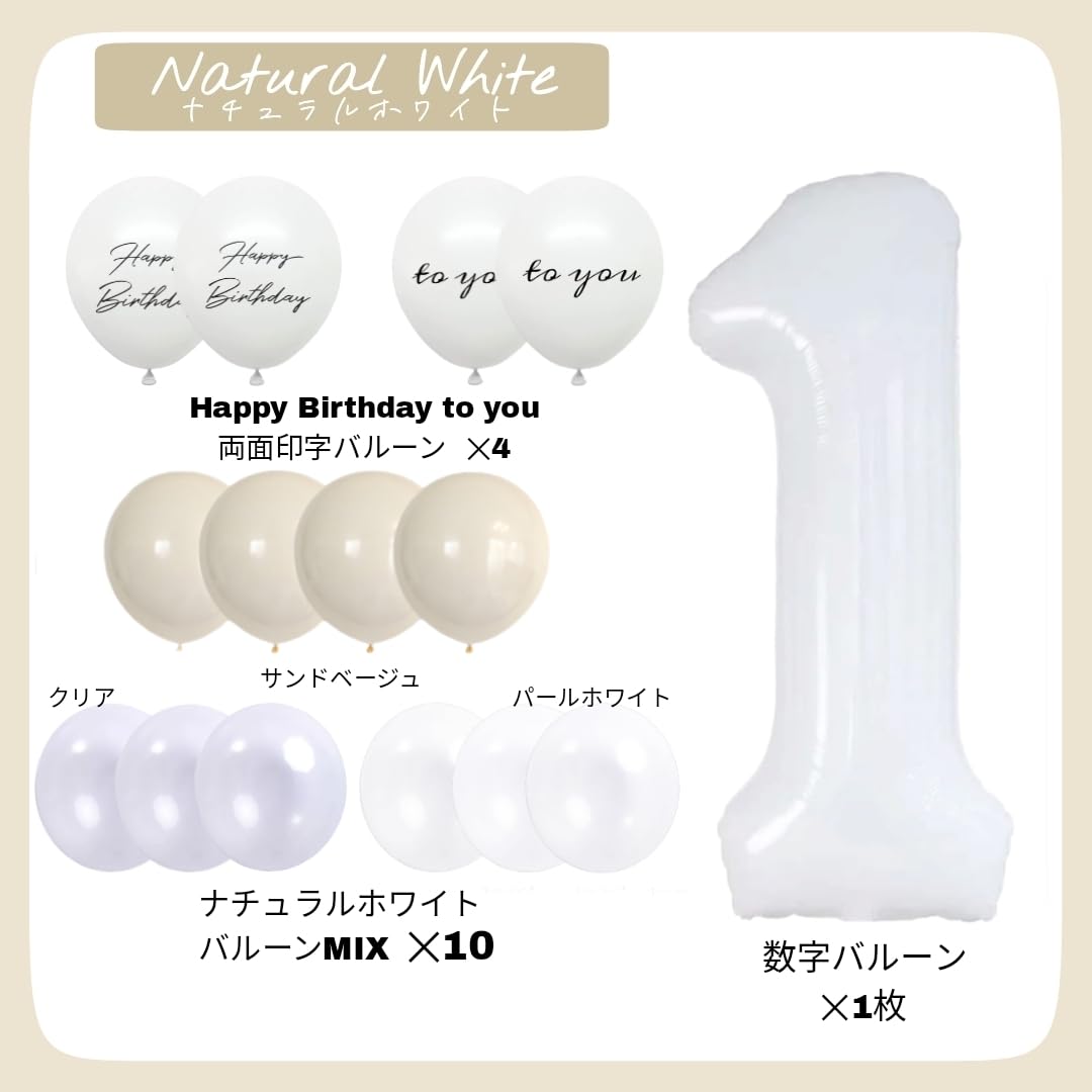 【選べる数字】大きなナンバーバルーン 1〜9の数字からお選び頂けます。 サンドベージュの落ち着いたカラーでお部屋などの雰囲気にもぴったり 表面はマット加工されているので写真撮影時に撮影者が映り込みしないのもポイント♪ 【選べるカラー】HAPPYBIRTHDAYのおしゃれな筆記体の印字バルーン付き 当店限定オリジナルデザインの筆記体バルーンは写真映え◎ お好みのお色が選べます 【満足なボリューム感】大きな数字バルーンに加え、14枚のボリューム満点のゴム風船のセットです。 【品質へのこだわり】 ひとつひとつの風船を日本国内にて検品しております。 天然ゴムを使用しているので小さなお子様にも安心してお使いいただけます ※風船は性質上膨らませての検品ができない商品となっております。そのため3-5%の不良品が含まれる場合がございますが、予備の風船をお付けしていますのでそちらをご利用下さい。