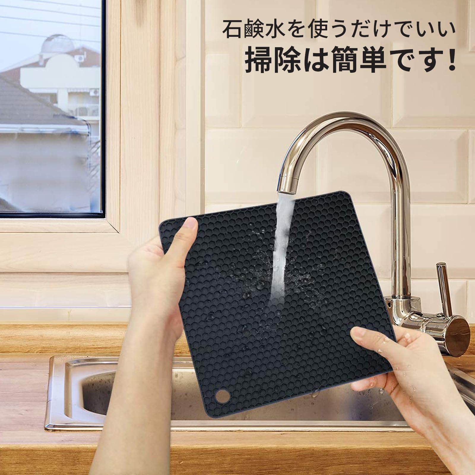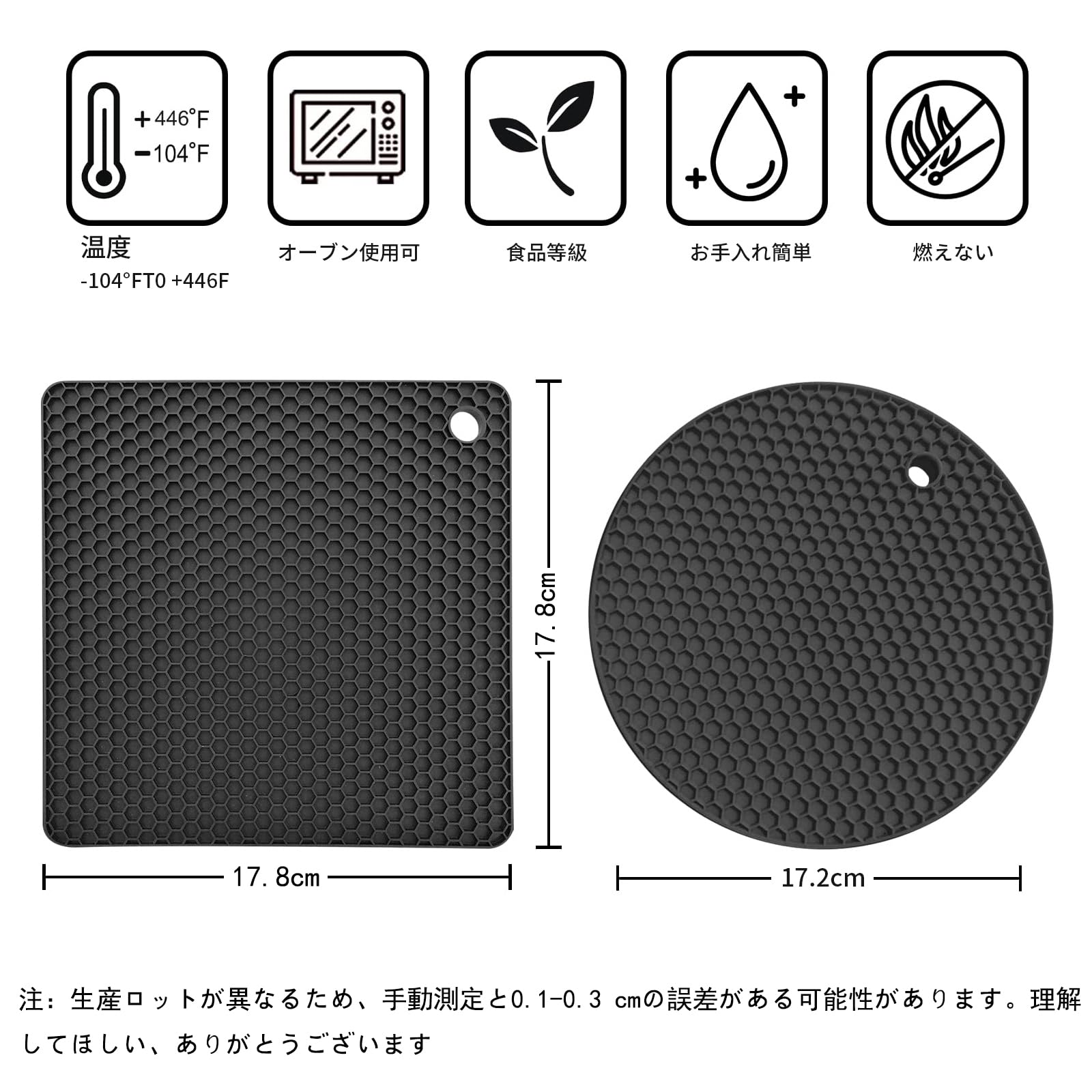 【商品情報】サイズ:18.2cm×18.2 厚さ6mm カラー:ブラック セット内容:4枚セット(四角2枚+円2枚) 【ハニカム構造採用で多用途!】ハニカム構造で滑りにくく、鍋つかみ・瓶のフタ開けとして利用でき、滑り止め効果があります。また、コースターとしても水滴が溢れにくくなっています。 【シリコン製鍋敷きの特徴】弾力性に優れた上質素材を使用、耐熱性能が高いシリコン製マット、熱を放散しやすいハニカムデザイン、伸縮性ばつぐんで破損しにくい、-40℃〜230℃までの耐冷・耐熱性。 【高い機能性】フック用の穴付きで収納しやすい、汚れても安心!水洗いOK、柔らかいから鍋つかみにもなる 【使い方いろいろ】土鍋やホーローなどの鍋敷きに、コースターやランチョンマットにもおすすめ、瓶オープナーとしても使えます