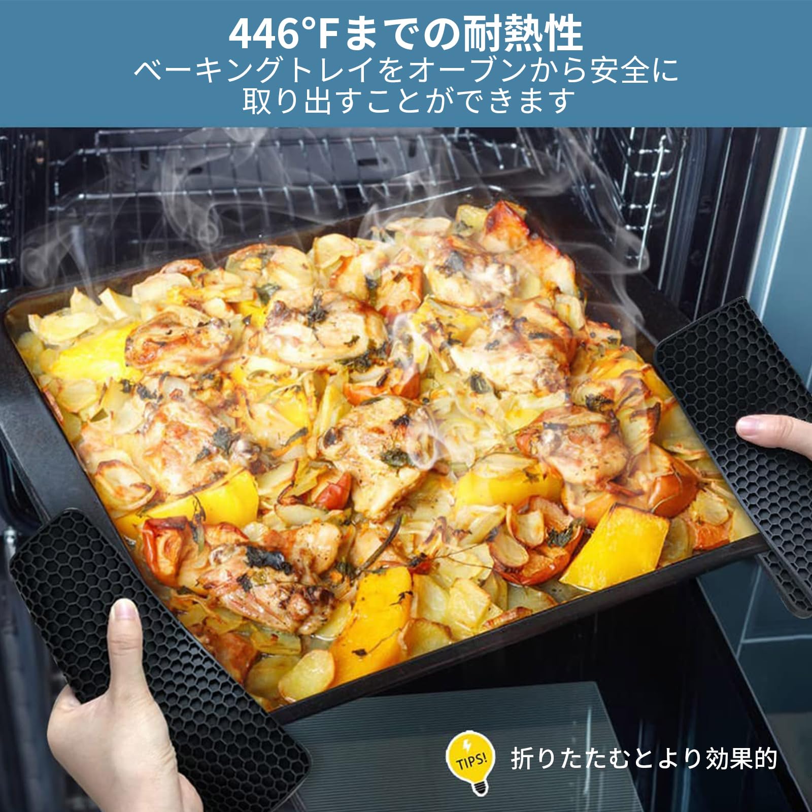 【シリコン製鍋敷きの特徴】弾力性に優れた上質素材を使用、耐熱性能が高いシリコン製マット、熱を放散しやすいハニカムデザイン、伸縮性ばつぐんで破損しにくい、-40℃〜230℃までの耐冷・耐熱性。