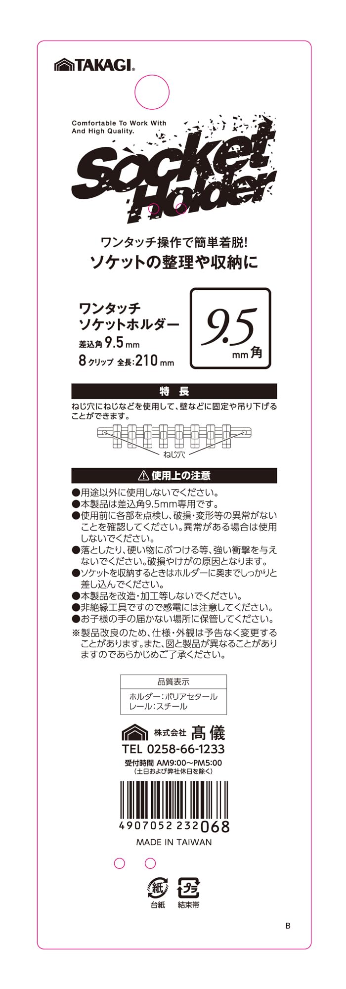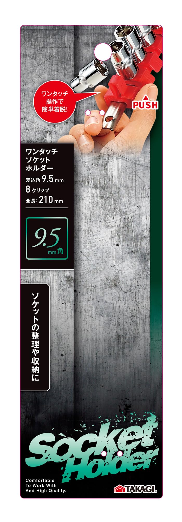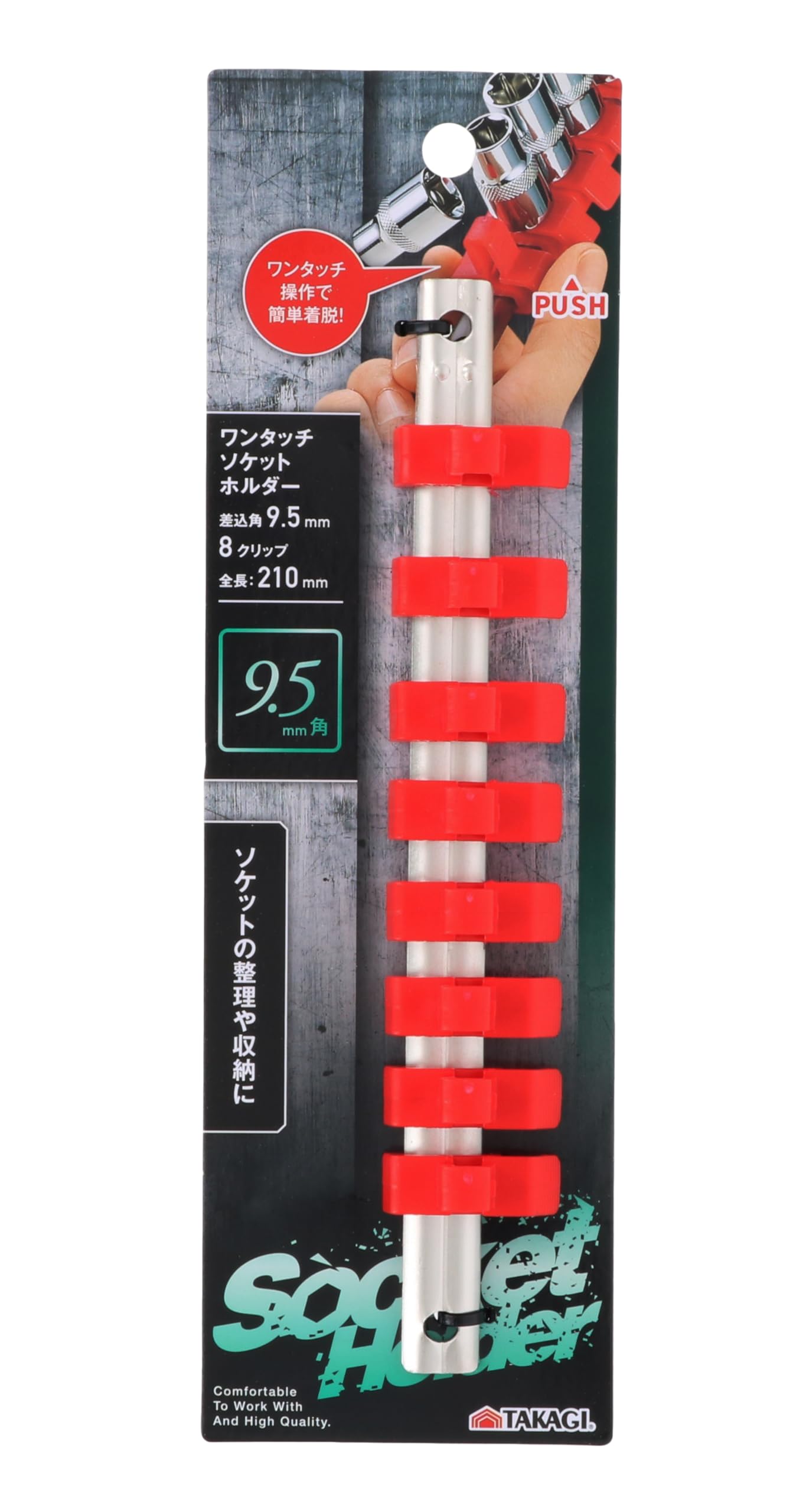高儀(Takagi) ワンタッチソケットホルダー 差込角9.5mm 8クリップ 全長210mm ソケットの整理や収納に 材質/ホルダー:ポリアセタール、レール:スチール セット内容:ホルダー×8、レール×1 差込角:9.5mm、クリップ数:8、全長:210mm 製造国:台湾 ●ソケットの整理や収納に●ワンタッチ操作で簡単着脱!ねじ穴にねじなどを使用して、壁などに固定や吊り下げることができます。