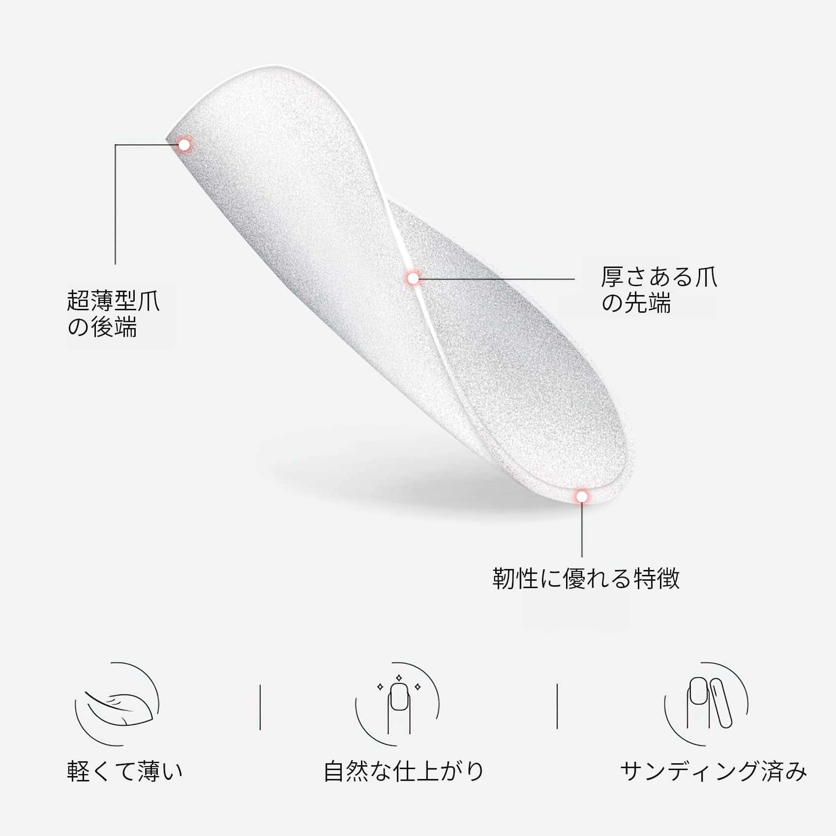 高品質:クリアネイルチップは耐衝撃性・靭性に優れるABS樹脂を採用し、柔軟性が高く、折り目がありません。0.2mmのチップが薄いので付け心地も抜群、軽くて薄くて後端部分、ナチュラルなラジアンでグルー漏れにくいです。