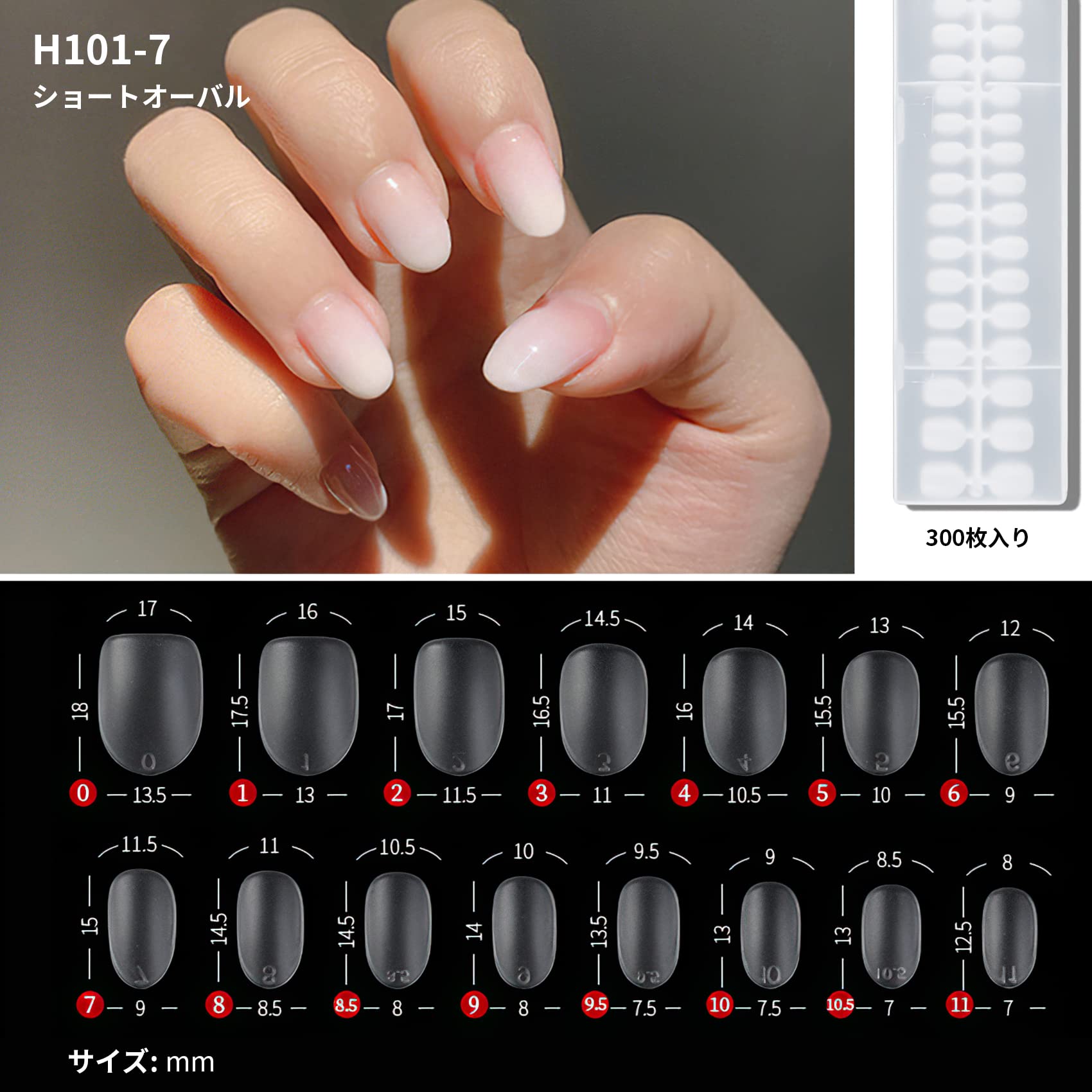 大容量で実用:ショートタイプのオーバル型ネイルチップセットです。15種類のサイズで様々な自爪のサイズに対応可能、合計300枚入り。付け爪、練習用どちらにもお使いいただけます。