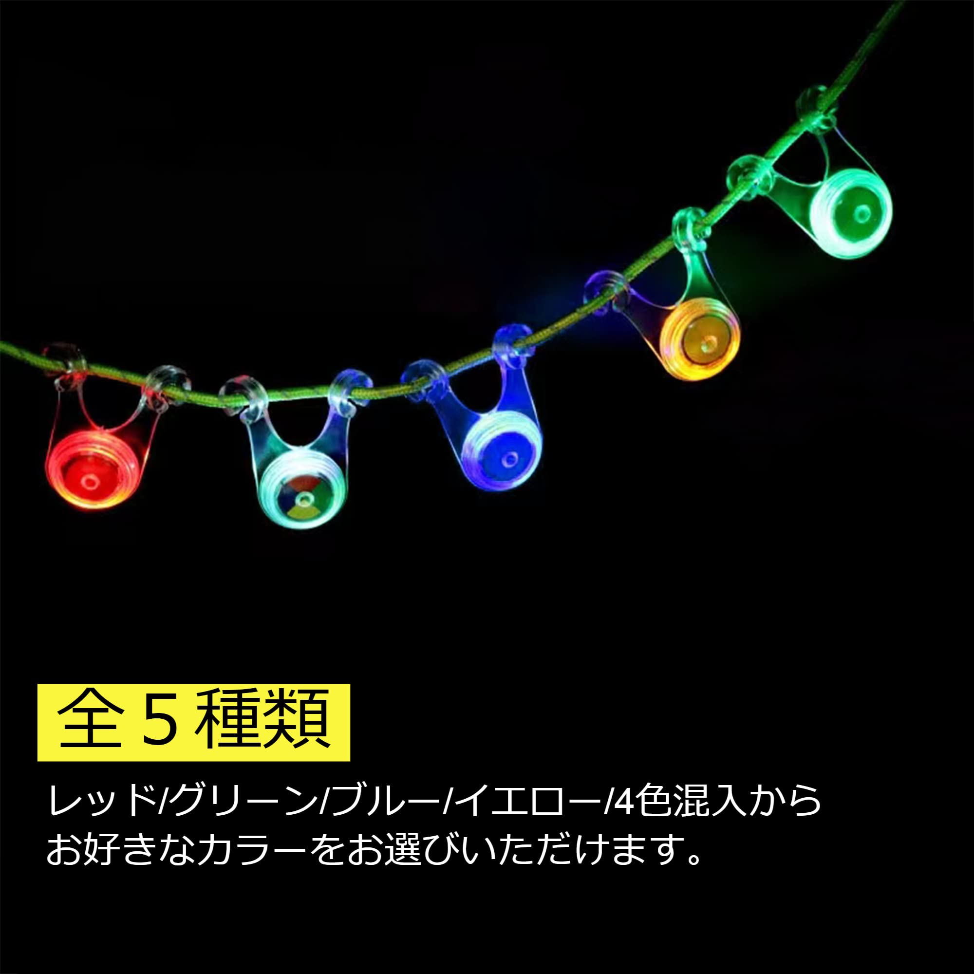 ★【商品仕様】 単品サイズ:約5.8cm x 6.2cm 単品重量:18g 梱包内容:LEDロープライト×10個(ボタン形電池 付き) 色:赤、黄、青、緑、レインボーからお選びいただけます。※混色タイプは「点灯モード」が4色に自動で切り替わった後、各色に点滅します。