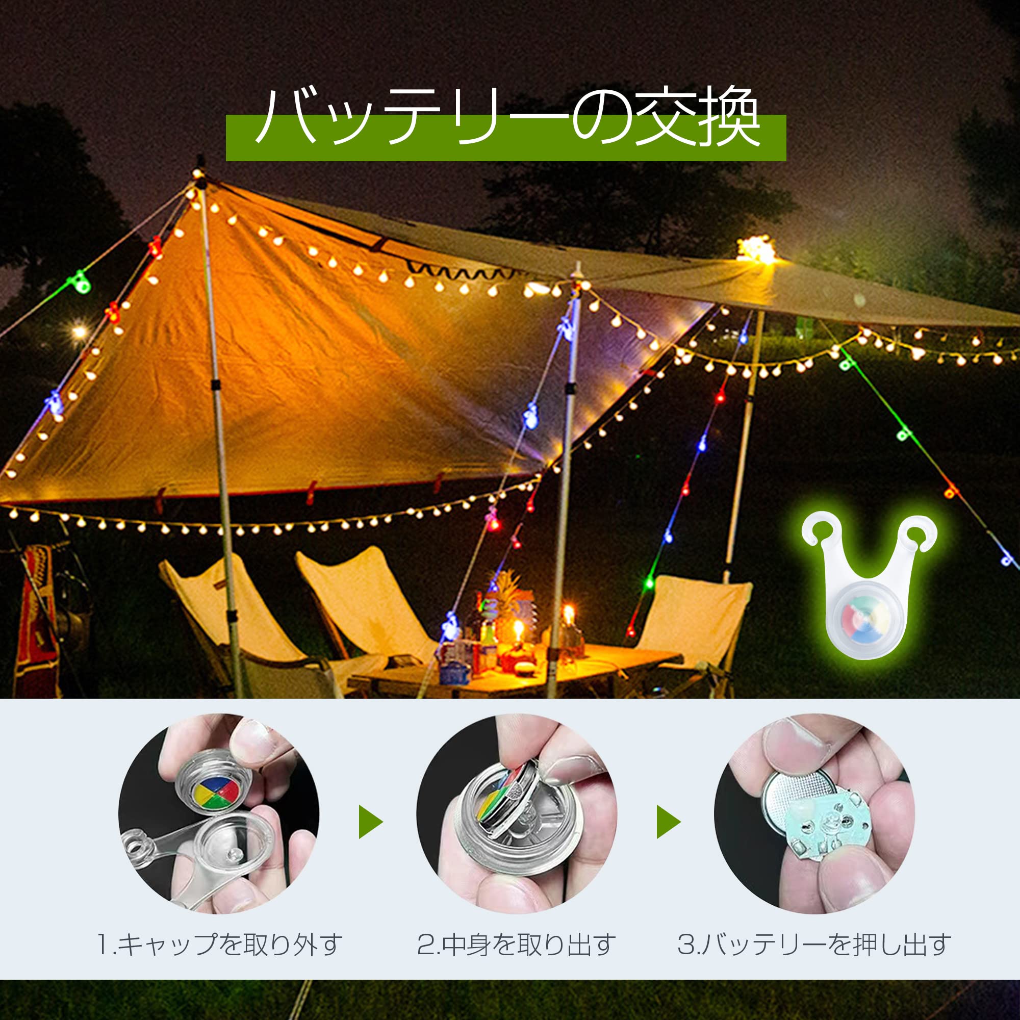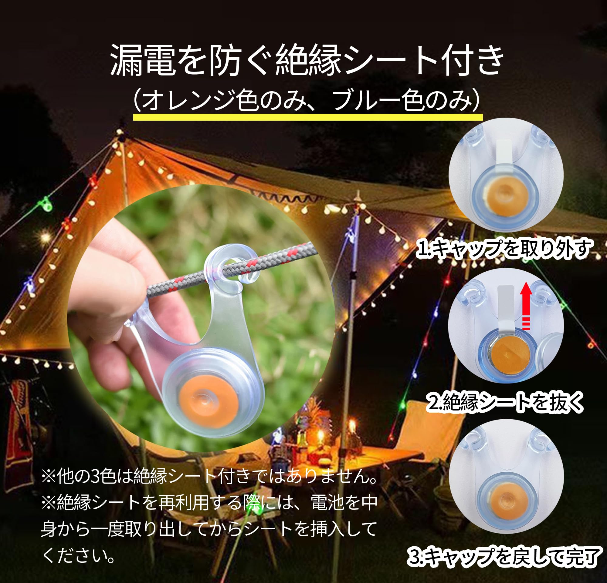 ガイロープに引っ掛けるだけで、テント周りの安全を確保。 1色10個セットです。 ※混色タイプは「点灯モード」が4色に自動で切り替わった後、各色に点滅します。※入荷時期により電池電量が切れてしまい、電源が入らない場合がございます。電池を変えて再度お試しください。