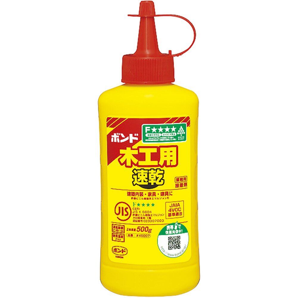 コニシ ボンド 木工用速乾 500g(ボトル) #40007 個装形態:ボトル 性状:酢酸ビニル樹脂系エマルジョン形 標準使用量(塗布量):150 200g/㎡ パッケージ重量: 0.56 kg 【特長】 ●健康住宅対応、水性、速乾、乾燥後ほぼ透明 ●乾燥後切削可 ●ホルムアルデヒド・フタル酸系可塑剤を使用していない 【用途】 ●乾燥時間が「ボンド 木工用」の約半分 ●学校や工作教室などグループでの木工作業 ●日曜大工 ●建築内装木工事・木製家具・建具の製作 ●額縁の製作