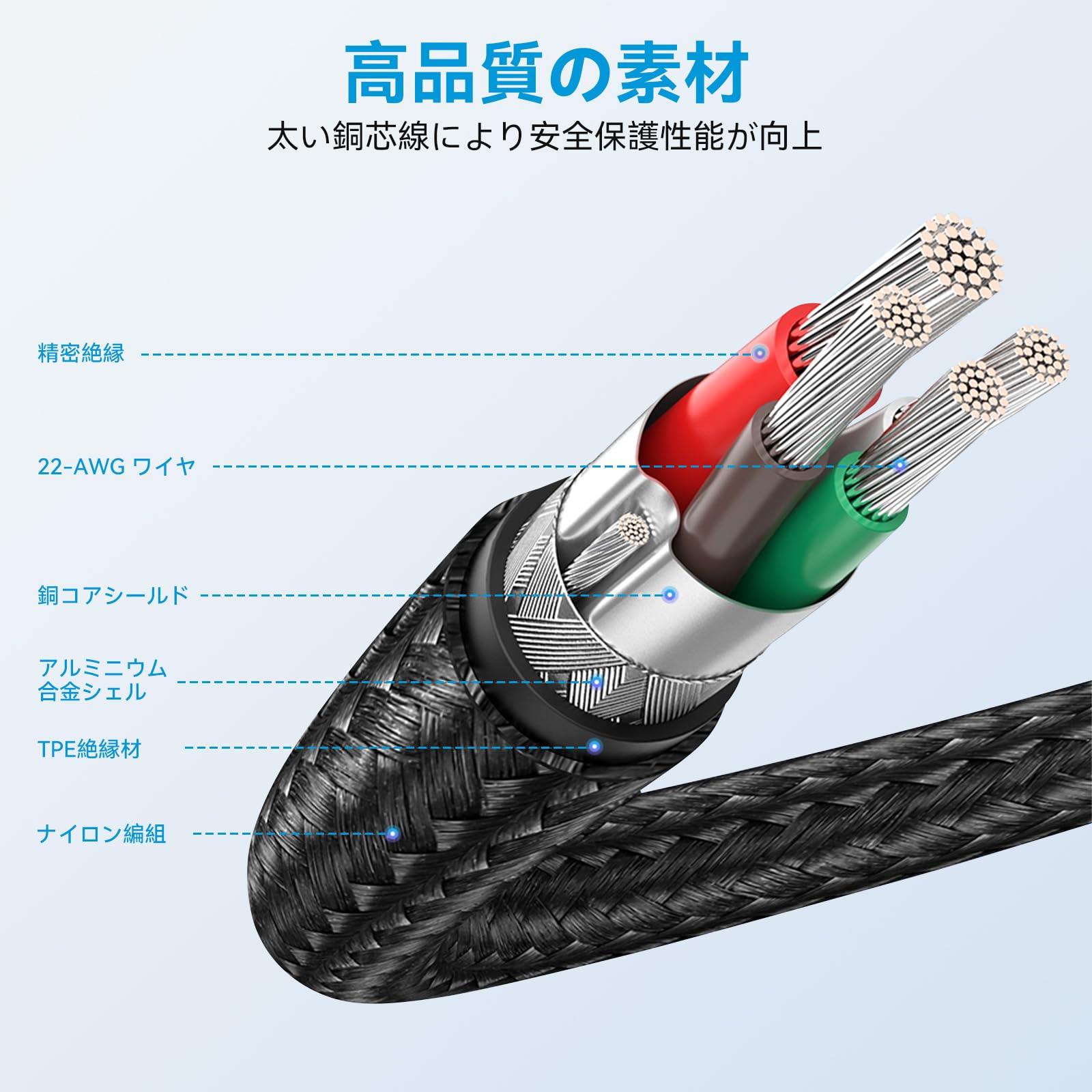 【高耐久ナイロン素材】usb c ケーブルはTPE素材とナイロン編みを採用して、絡まりと引っかき傷や伸びを防ぎ、素早く熱を放散できます。ニッケルメッキのインターフェースは強力な干渉防止と酸化防止ができます。22AWGの太い銅線は優れた導電性を実現できます。耐用年数を延ばします。