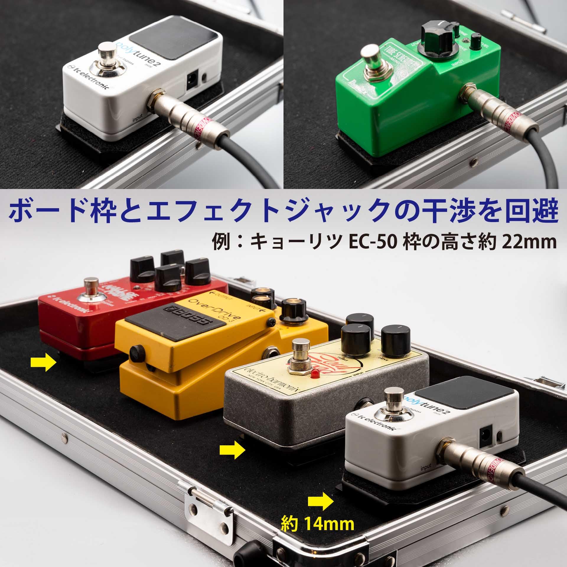 14mmのかさ上げ量は慎重な検討の結果、絶妙な高さとして決定されました。ARMORやキョーリツKCシリーズなどの枠のあるエフェクトボードでは、エフェクトボードのフレームとジャックが干渉してしまうことがありますが、14mmのかさ上げで多くのエフェクトでこの問題を解消できます。