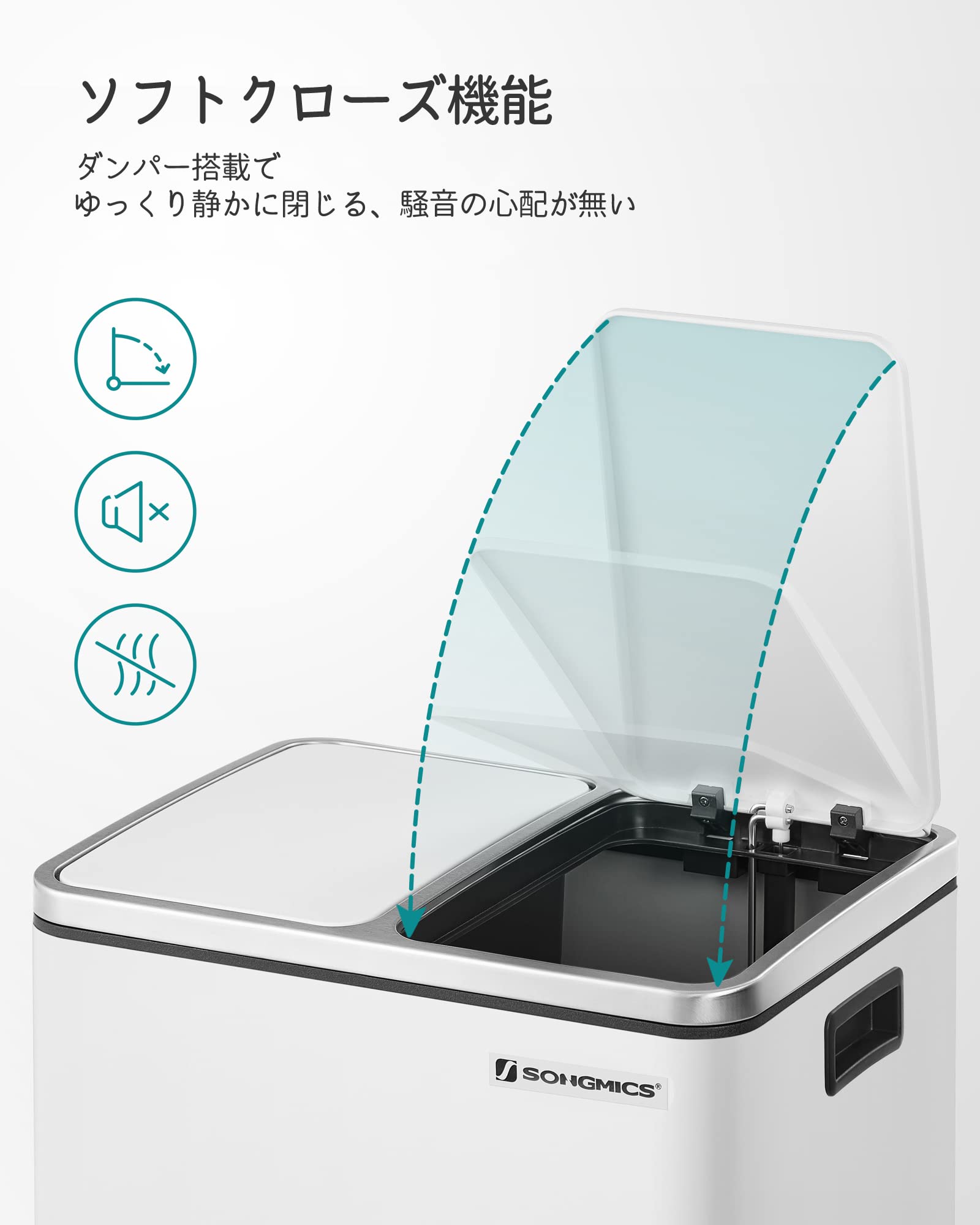 【在庫のみ】SONGMICS ダストボックス ゴミ箱 ペダル式 2分別 蓋付き 2×15L インナーバケット2つ ステンレス 密閉 音無し おしゃれ 横型 室内 ベランダ LTB30WT