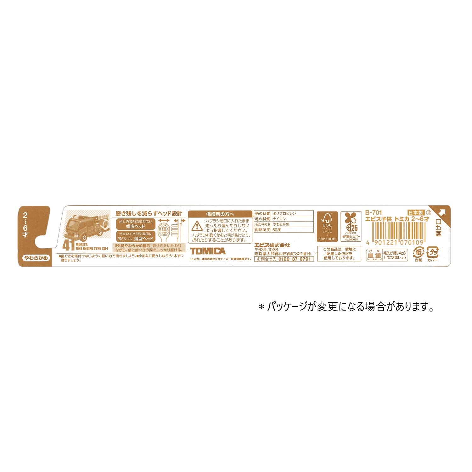 磨き残しを減らす幅広×薄型ヘッド設計。ハブラシが幅広ヘッドなので、ブラッシングが不慣れな子供でも磨き残しが少なくなります。従来品よりも30%厚みをダウンさせた薄型ヘッドで小さな口内でも操作しやすく、せまいすき間や奥歯にも届く。外側やわらかめ植毛で、歯ぐきをいたわりながら歯と歯ぐきの間をしっかり磨ける。■対象年齢 2才・3才・4才・5才・6才■毛のかたさ:やわらかめ■毛の材質:ナイロン■柄の材質:ポリプロピレン■耐熱温度:80度■日本製■個装サイズ:33×230×15mm 15g