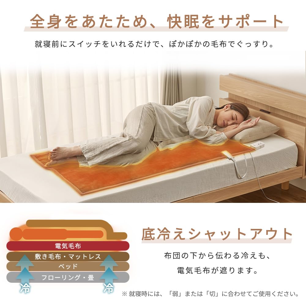 ふんわり手触り、ぽかぽか毛布でぐっすり。敷きタイプの電気毛布。【底冷えシャットアウト】就寝時は布団の下から伝わる冷えを防いで、電気毛布があたためる。寝室のほかリビングなど、床冷えがツライ時に気軽に使えるちょうどいいサイズ。