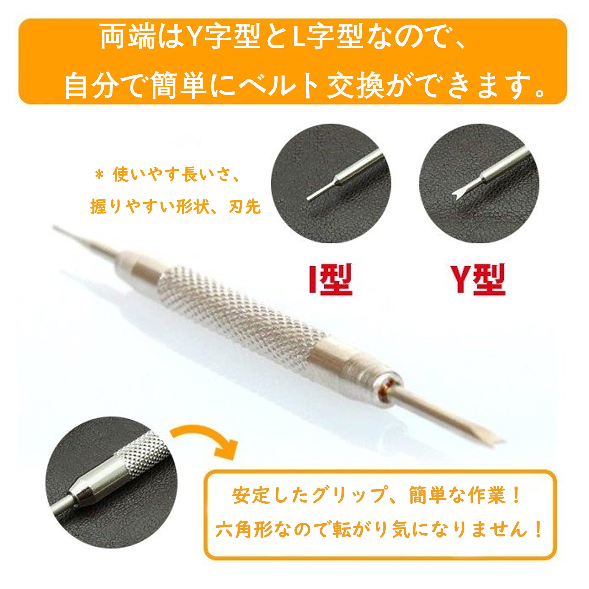 【バネ棒はずしの仕様】V字とI型に分けられ、ステンレス鋼製、全長約83mm(これ1本で革バンドと金属バンドのバネ棒外しに対応します。)