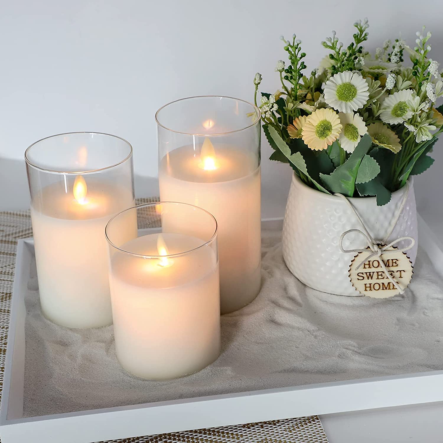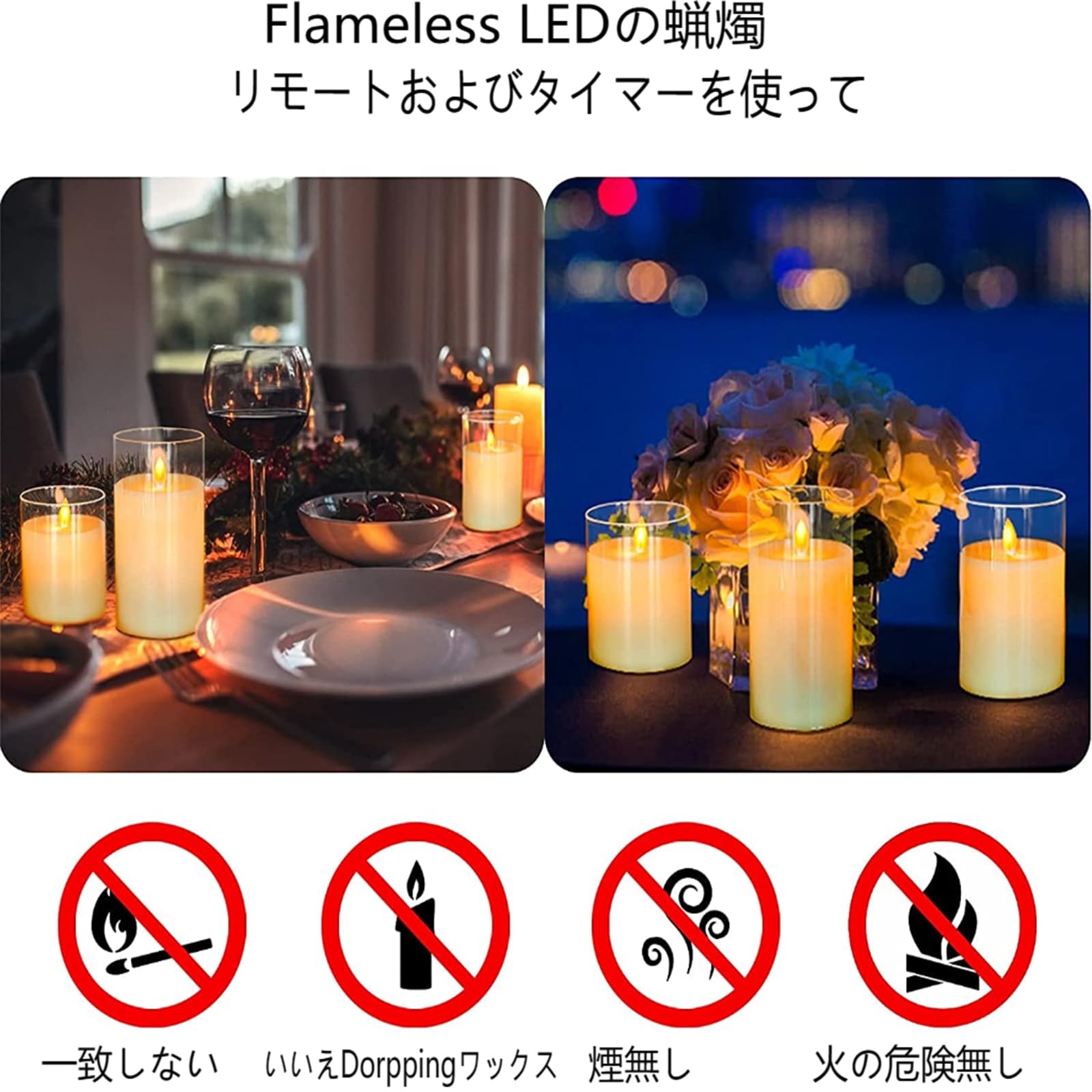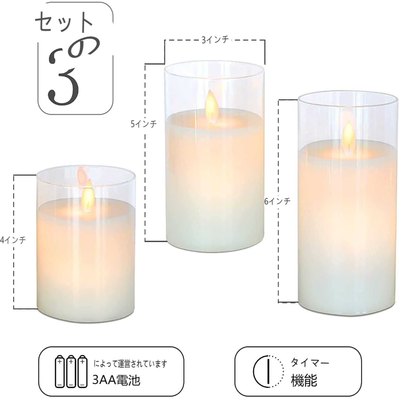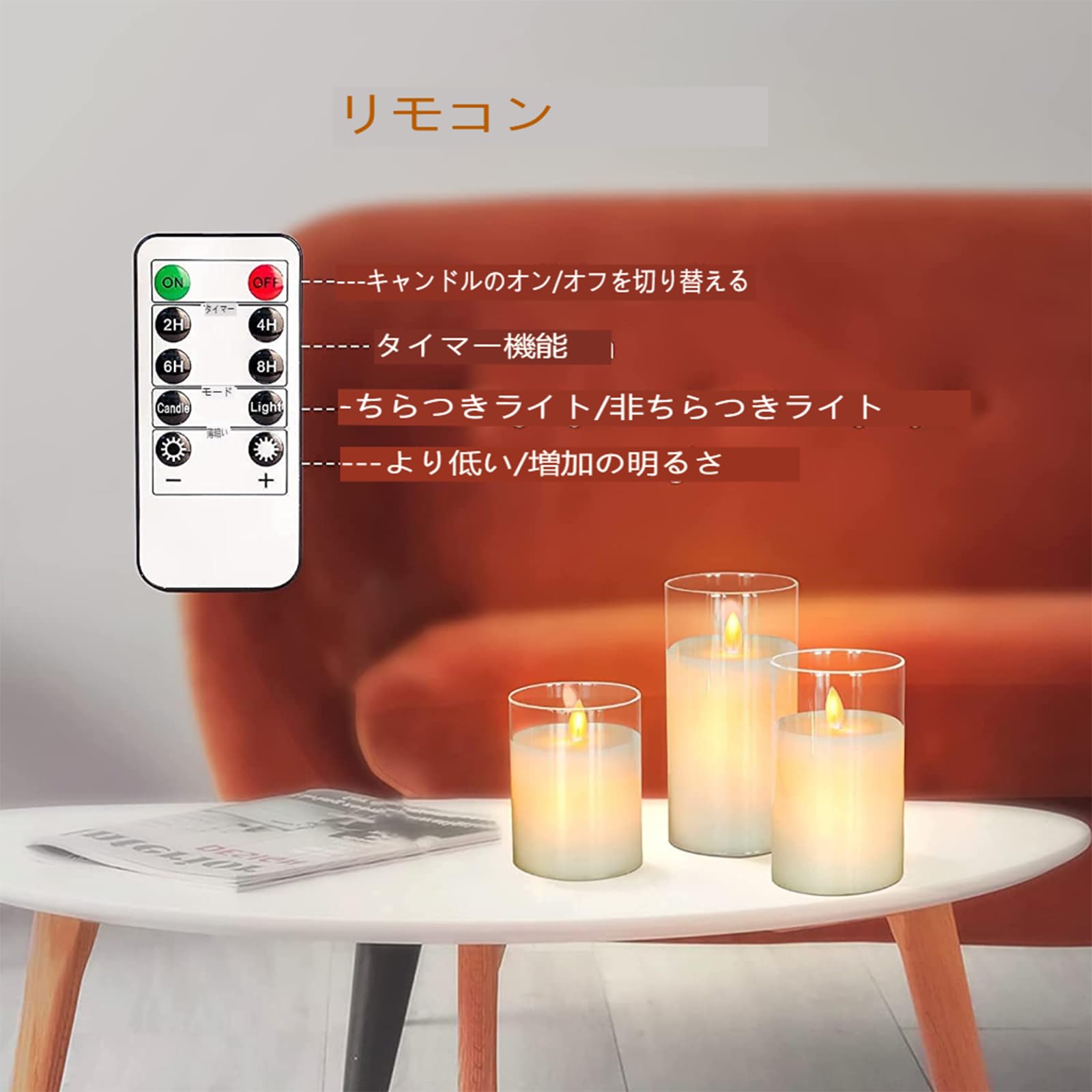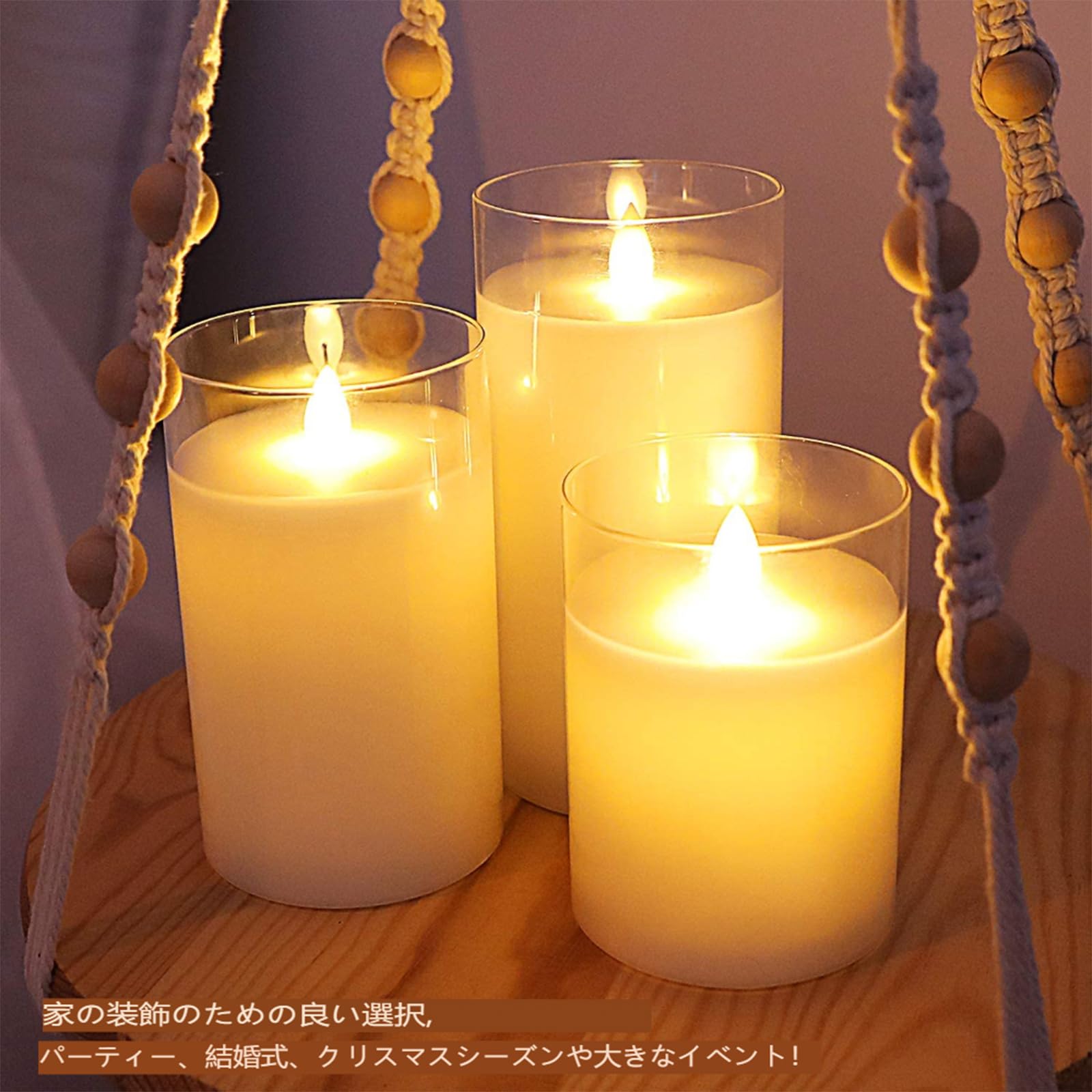 LEDキャンドルライト クリアガラスホワイト ロウソク 本物の炎のようにゆらめく3点セット 暖色光 火を使わない ゆらゆら揺れる 安全 省エネ 専用リモコン付き 明るさ調整 電池式 LEDライトキャンドル