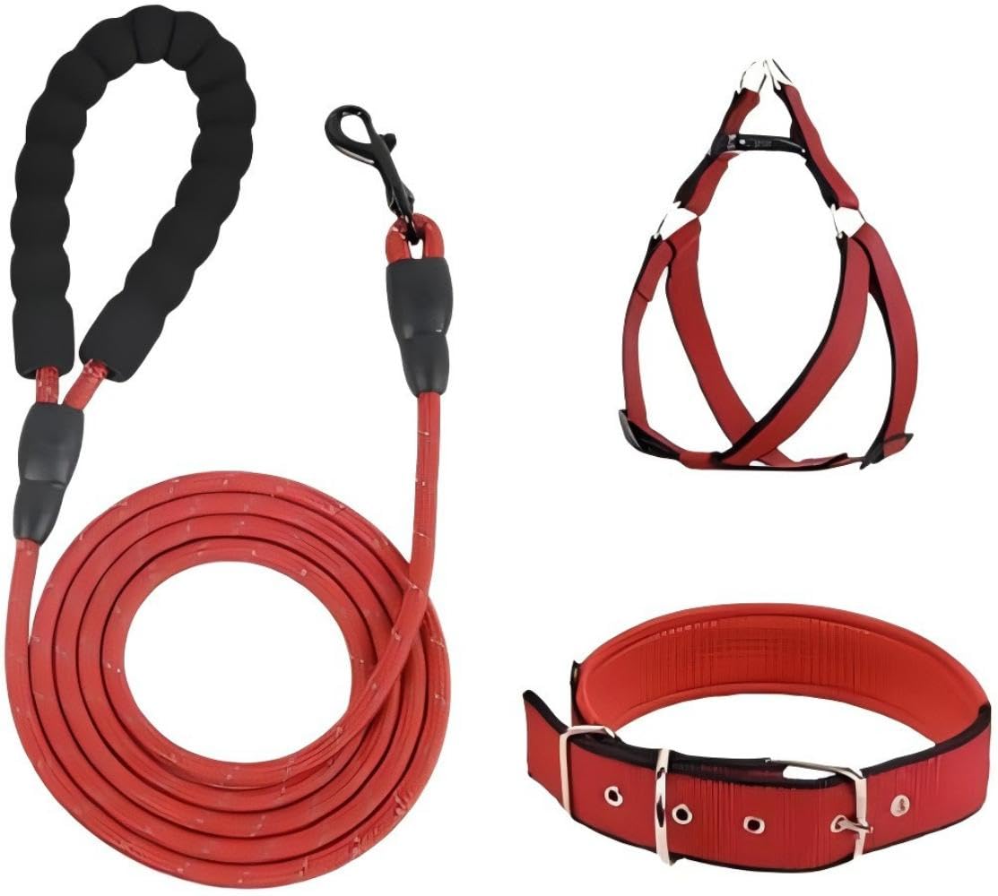 【努力特価】犬用リードセット、首輪・ハーネス・リード3点セット、小型・中型犬用、赤と黒 (10mm * 1.5m Lサイズ[約20-40ポンド])