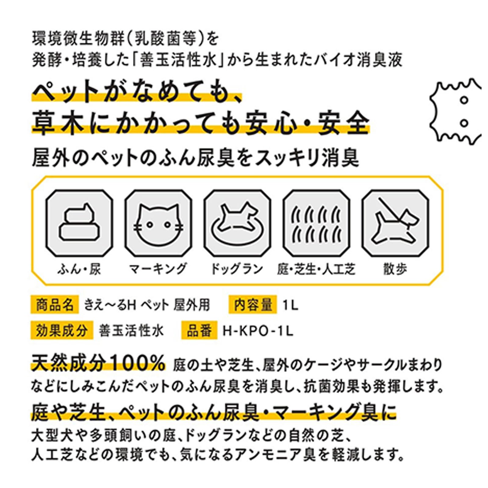 環境大善 消臭剤 きえーるH ペット 屋外用 1L 日本製 詰め替え 無香料 ニオイ ベランダ 庭 犬 猫 H-KPO-1L