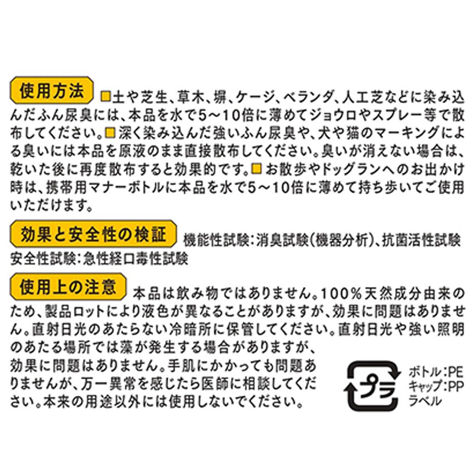 ●本商品は天然由来成分100%で作られています。 使用方法 ペットのふん尿臭・マーキング臭は本品を原液のまま散布してください。 庭の土や芝生、人工芝に染み込んだふん尿臭には、本品を散布後に軽く水をかけることで 効果的に消臭できます