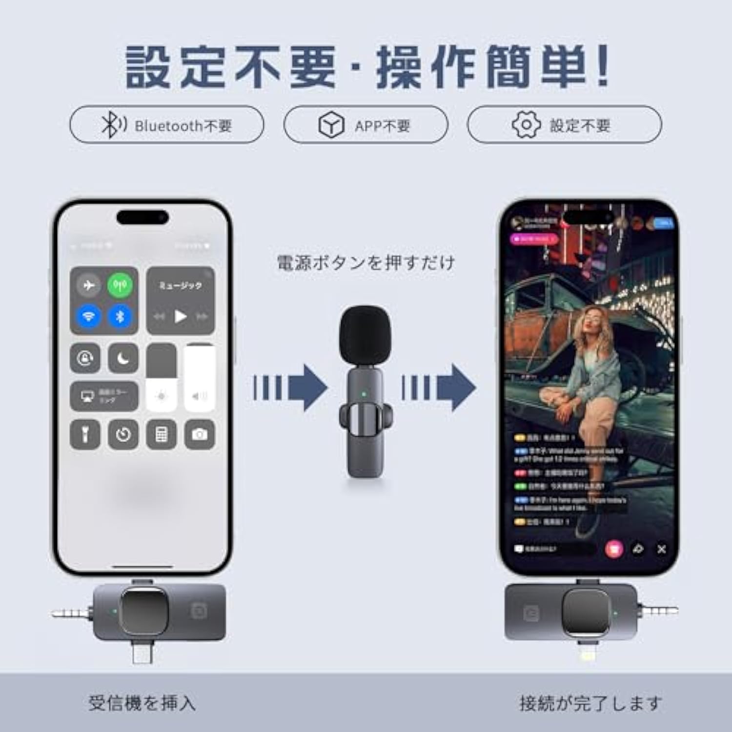 【超低遅延 & 多機能受信機】0.003秒の超低遅延を実現し、音と映像の完璧な同期をします。さらに、このマイクの受信機は、Type-C、Lightning、3.5mmの3種類のインターフェースに対応しており、スマートフォン、タブレット、カメラなど多様なデバイスで使用できます。充電しながらの使用も可能な充電パススルー機能を備え、長時間の撮影にも対応します。
