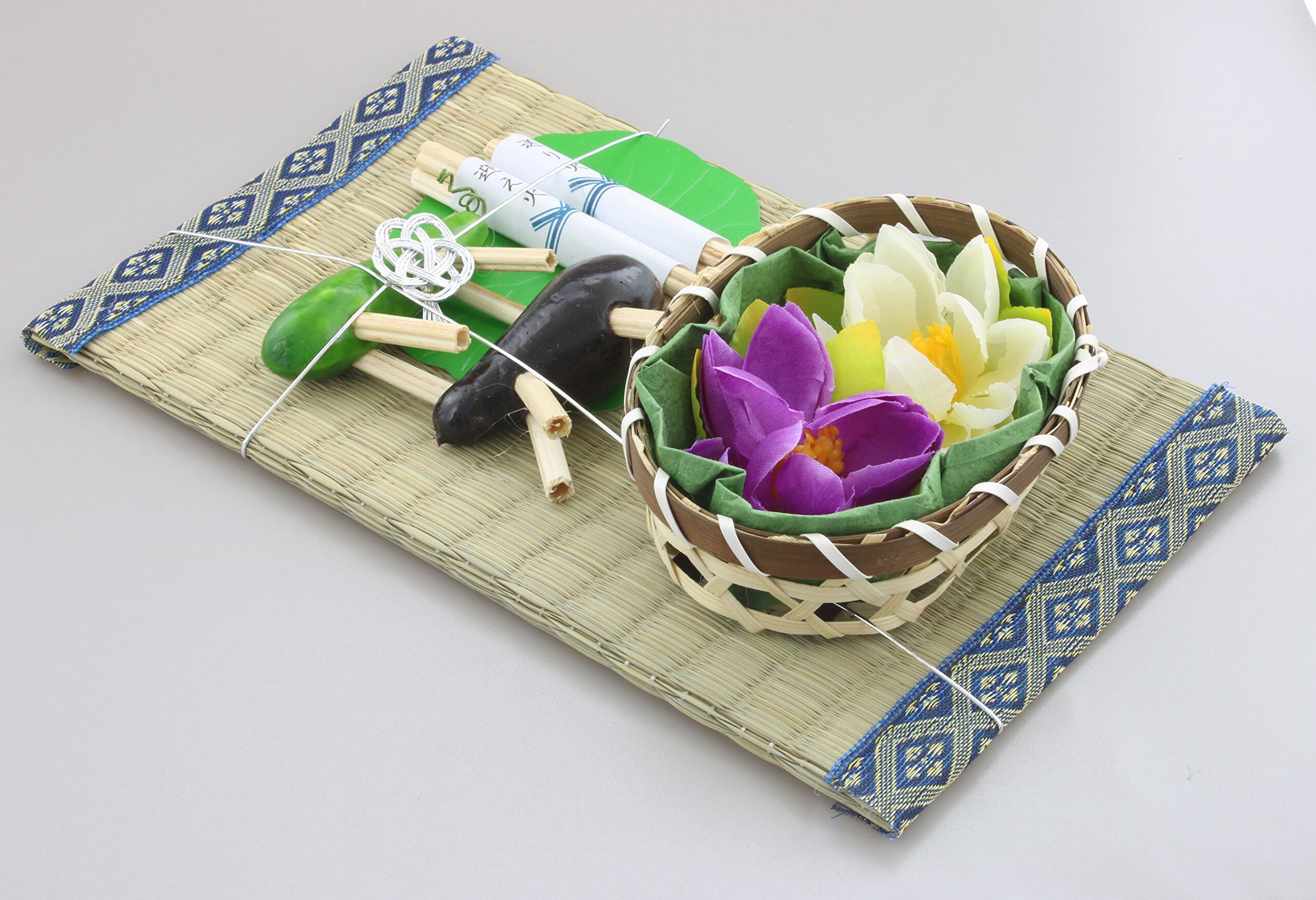 セット内容:台座(いぐさ)、麻ガラ、ハスの葉(紙)、ハスの花(籠付き)、牛馬(なす・きゅうり)