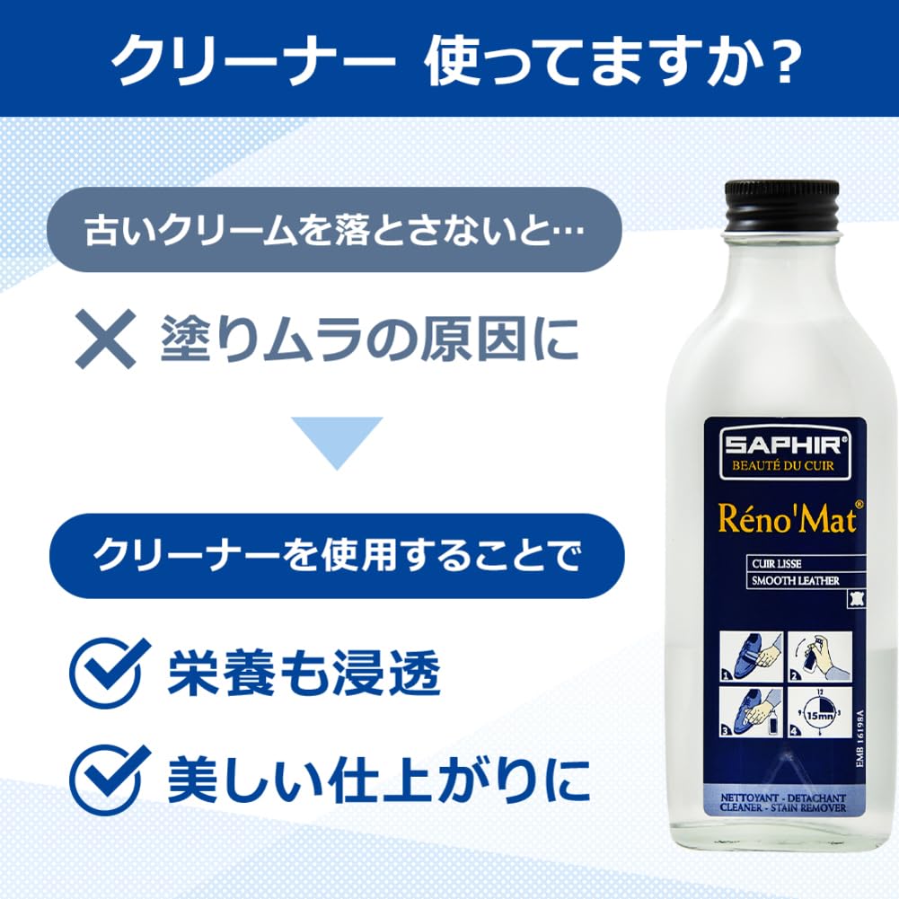 [サフィール] 強力 革用 クリーナー レノマット リムーバー ステイン 革靴 革製品 手入れ 汚れ落とし レザークリーナー 靴 シミ カビ取り 塩ふき ポリッシュ ワックス 靴磨き 100ml