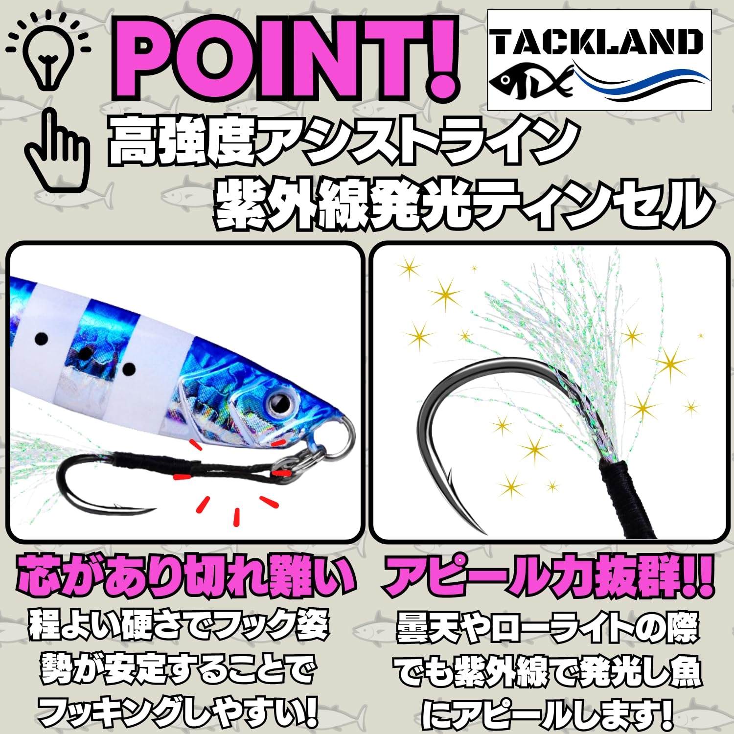 ??【紫外線発光ティンセル】 アシストフックには紫外線(UV)発光 ティンセルが搭載されております。濁りやローライト時でもキラキラと発光することで魚にアピールすることができます。マイクロベイトパターンや低活性の魚にも効果的です。大型青物だけでなく、大型のアジやサバは特にティンセルによるアピールが効果的の為効果抜群です。