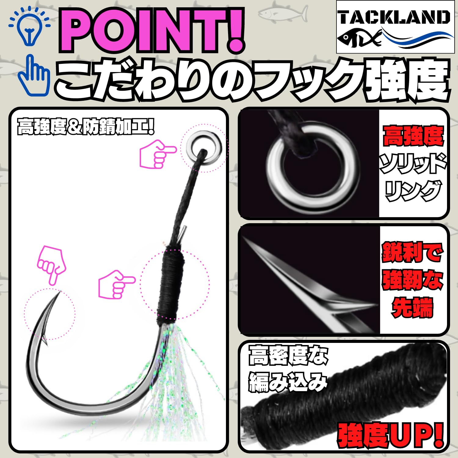【人気】【TACKLAND】 アシストフック シングル ソリッドリング付き 高コスパ 10本入り S M L サイズ ティンセル付き 防錆 大物対応 強靭フック LSJ ショアジギ メタルジグ 釣り 青物 シーバス