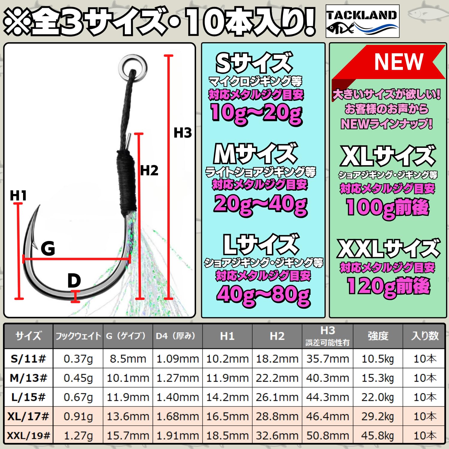 ??【DAISOジグ・セリアジグのカスタムにも最適!】ジグの交換用はもちろん某100円ショップルアーのフックカスタマイズにもピッタリです。高コスパですがしっかりとした強度があるため安心してお使い頂けます。DAISOジグ18gにはSサイズ。28g〜40gにはMサイズがオススメです。のアシストフックはフックラインの長さや強度が安定している為、1個ずつの個体差が無く安定、ご安心にご使用頂けます。