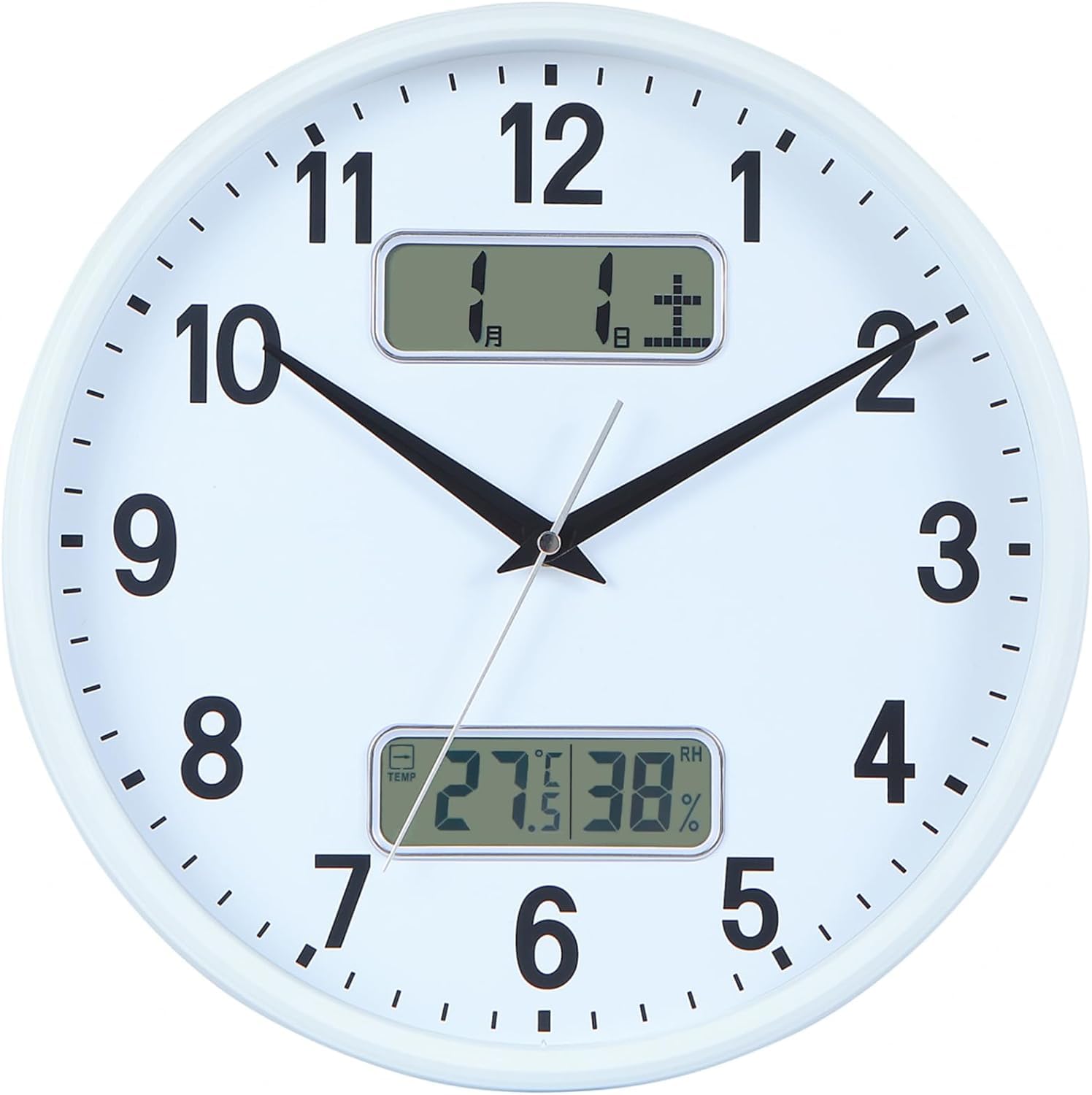 掛け時計 電波時計 アナログ カレンダー 温度 湿度 表示 直径32cm 静音 連続秒針 ホワイトLCD-B8747