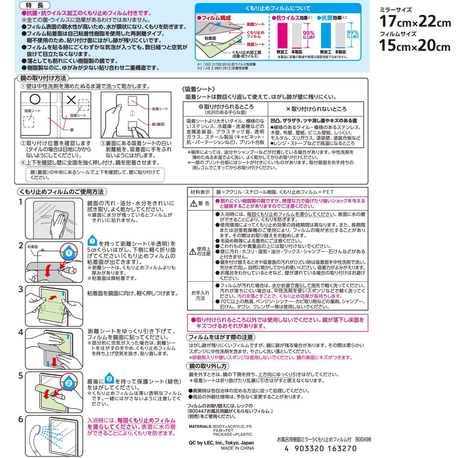 レック(LEC) お風呂用樹脂ミラーS 鏡サイズ:17×22cm くもり止めフィルム付 B00498