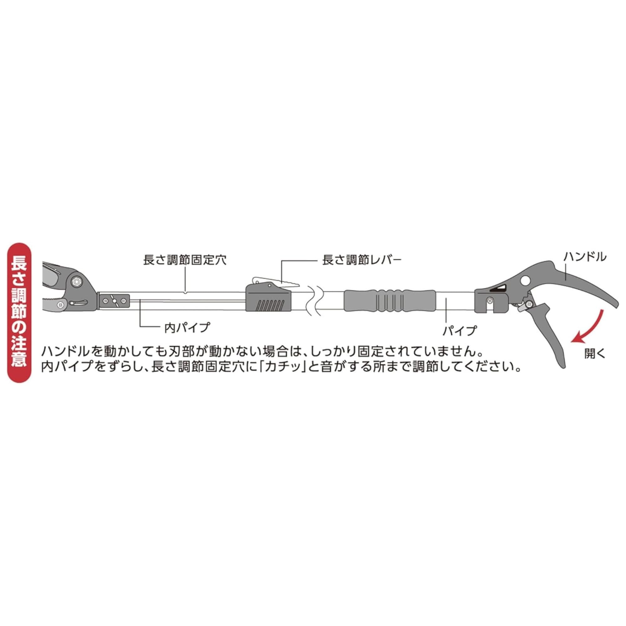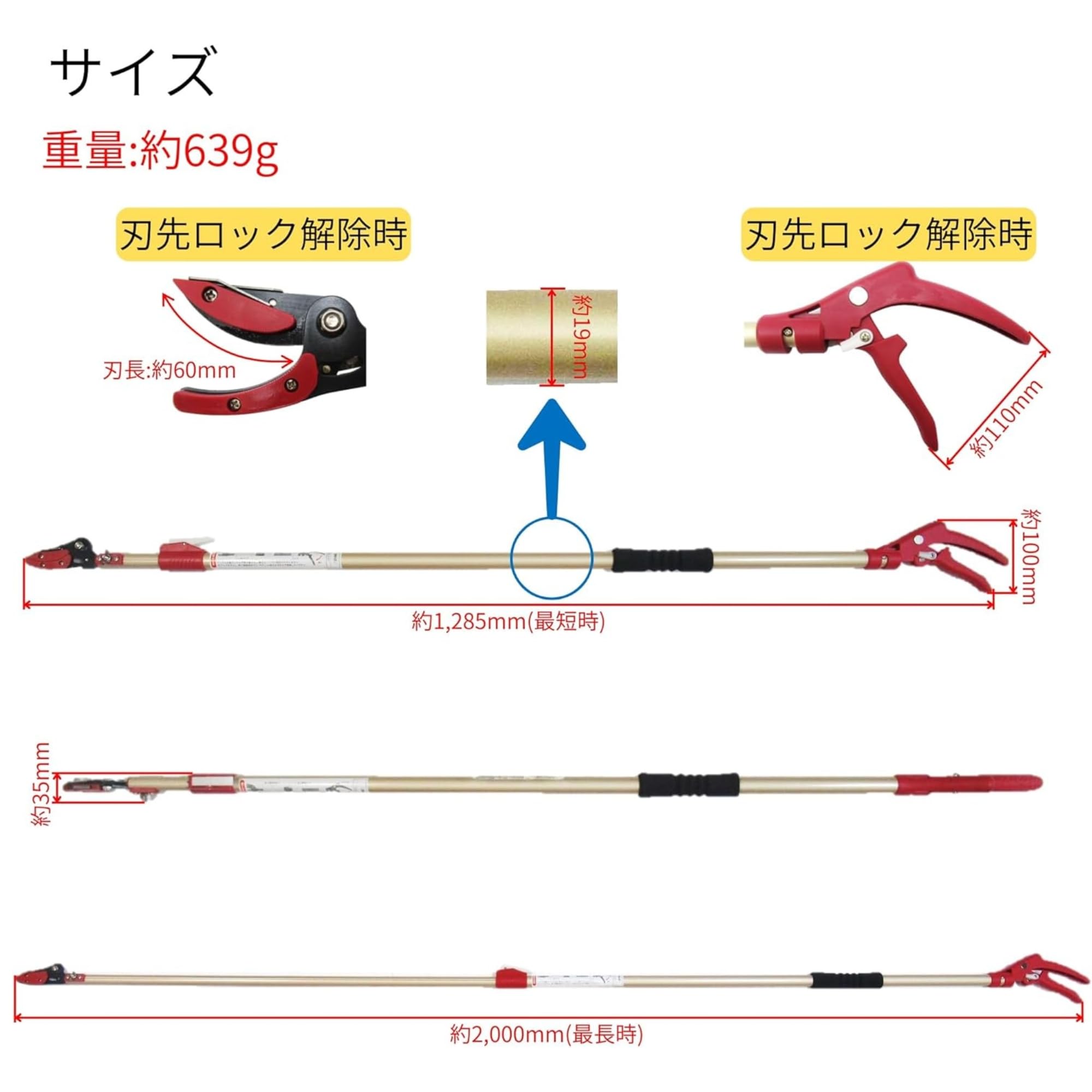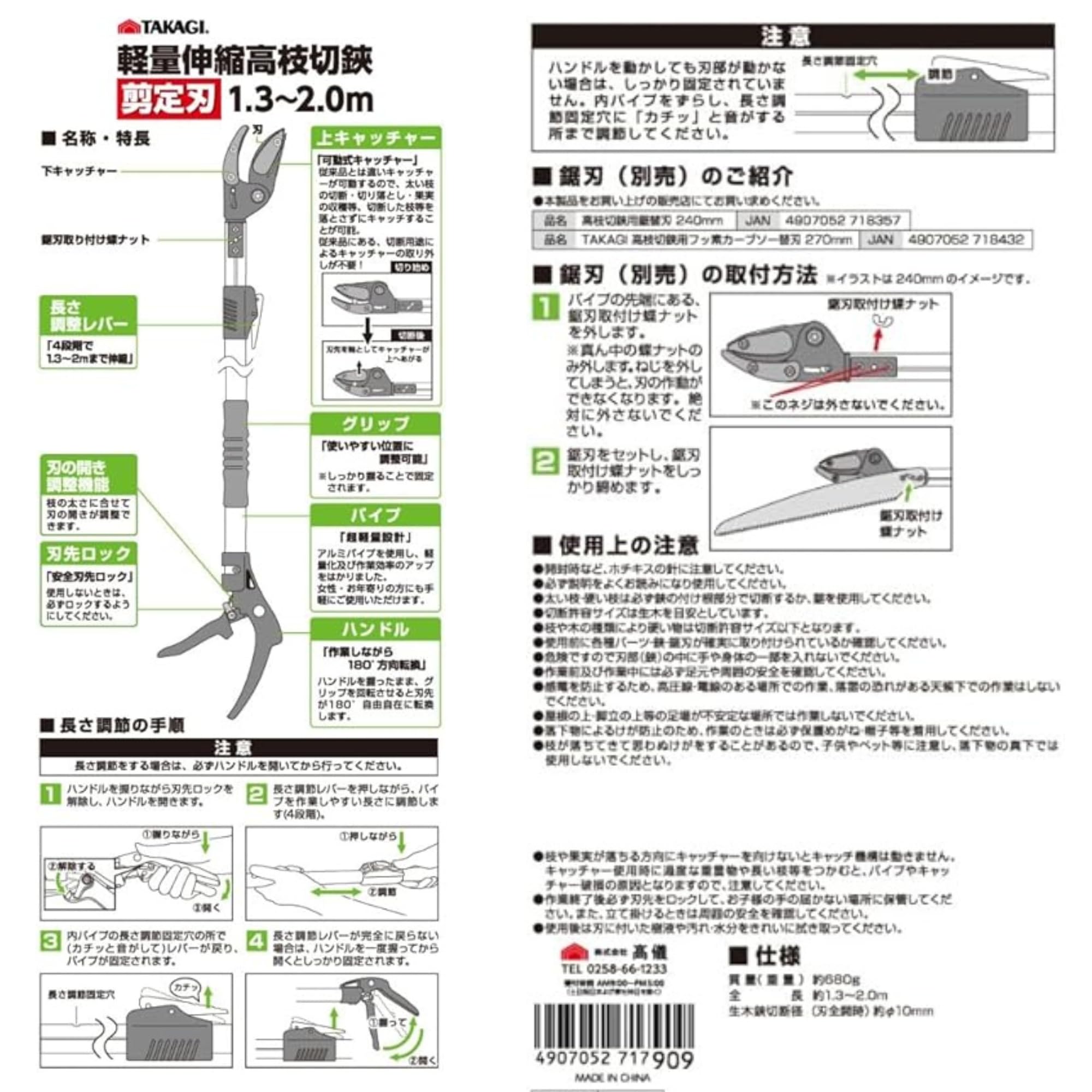 高儀(Takagi) 軽量伸縮高枝切鋏 剪定刃1.3-2.0m 高枝切りバサミ 高枝切狭 軽量 高枝切はさみ 高い位置の庭木の剪定に 切断許容サイズ(刃全開時):生木約φ10mm 全長:約1.3~2.0m 本体重量:約680g 製造国:中国 ●高い位置の庭木の剪定に●軽量&コンパクト●可動式キャッチャー採用●刃の開き調整可能●鋸刃取付け可能(別売)
