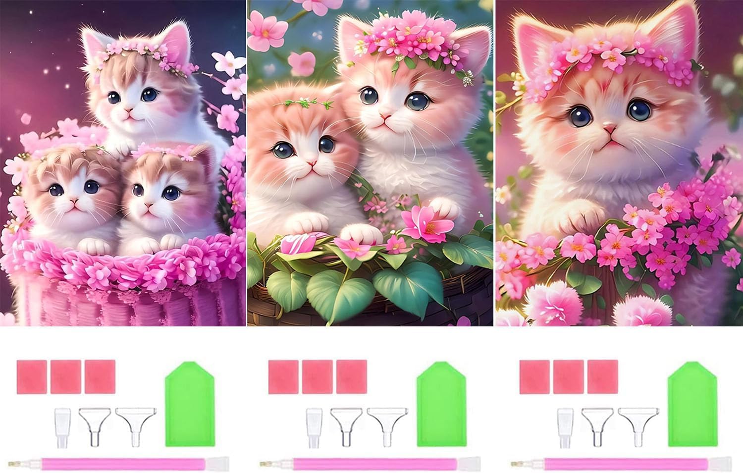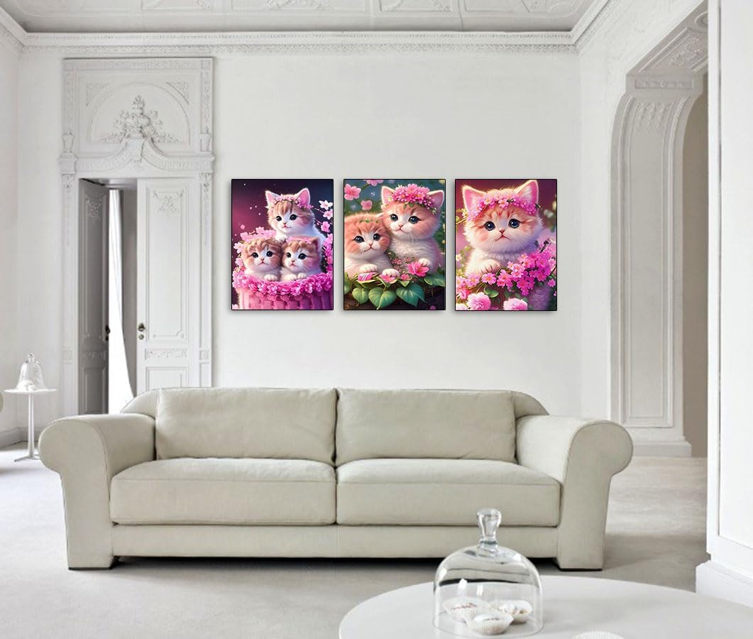 3個セット ダイヤモンドアート キット,BetterJonny ダイアモンドビーズ絵画キット 5D ダイヤモンド キットアート壁アート ピンクの猫 手作り絵画手芸キット 全面貼り付けタイプ DIY 手芸キット初心者 大人 子供 30x40cm