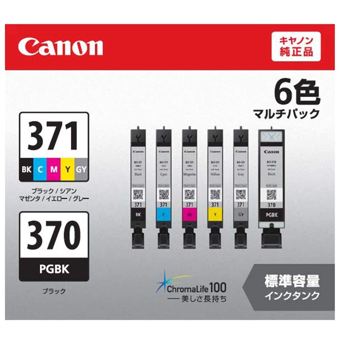 キヤノン Canon 純正 インクカートリッジ BCI-371(BK/C/M/Y/GY)+370 6色マルチパック BCI-371+370/6MP 純正インク インクタイプ:染料+顔料 キヤノン純正インクは、キヤノンインクジェットプリンター専用に開発されています。 サイズ: 通常 進化する美しさ、キヤノン純正インク