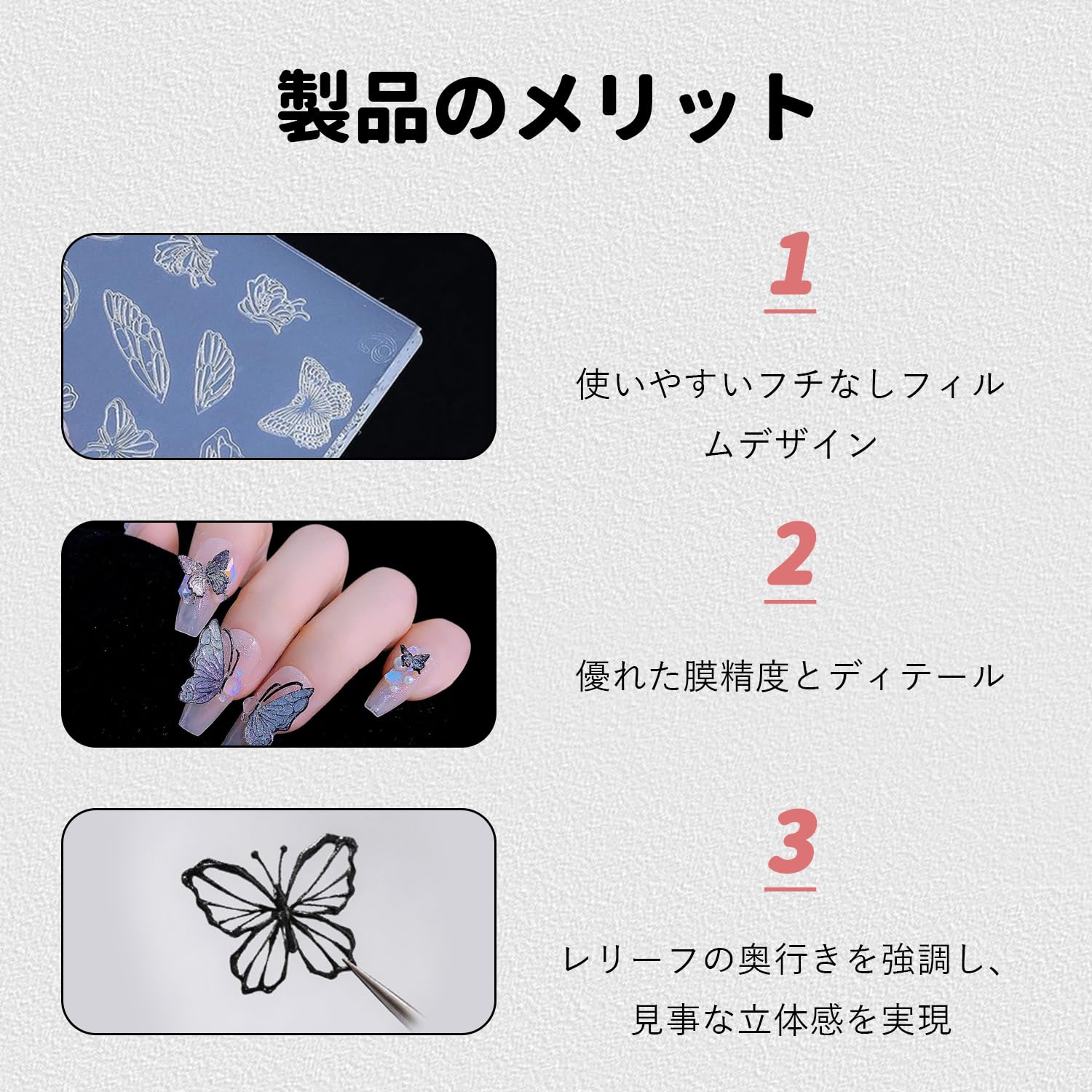 【3Dデザイン 】この蝶の型は立体的なデザインなので、蝶がリアルで美しく、マニキュアがエレガントでスタイリッシュな手元を演出します。