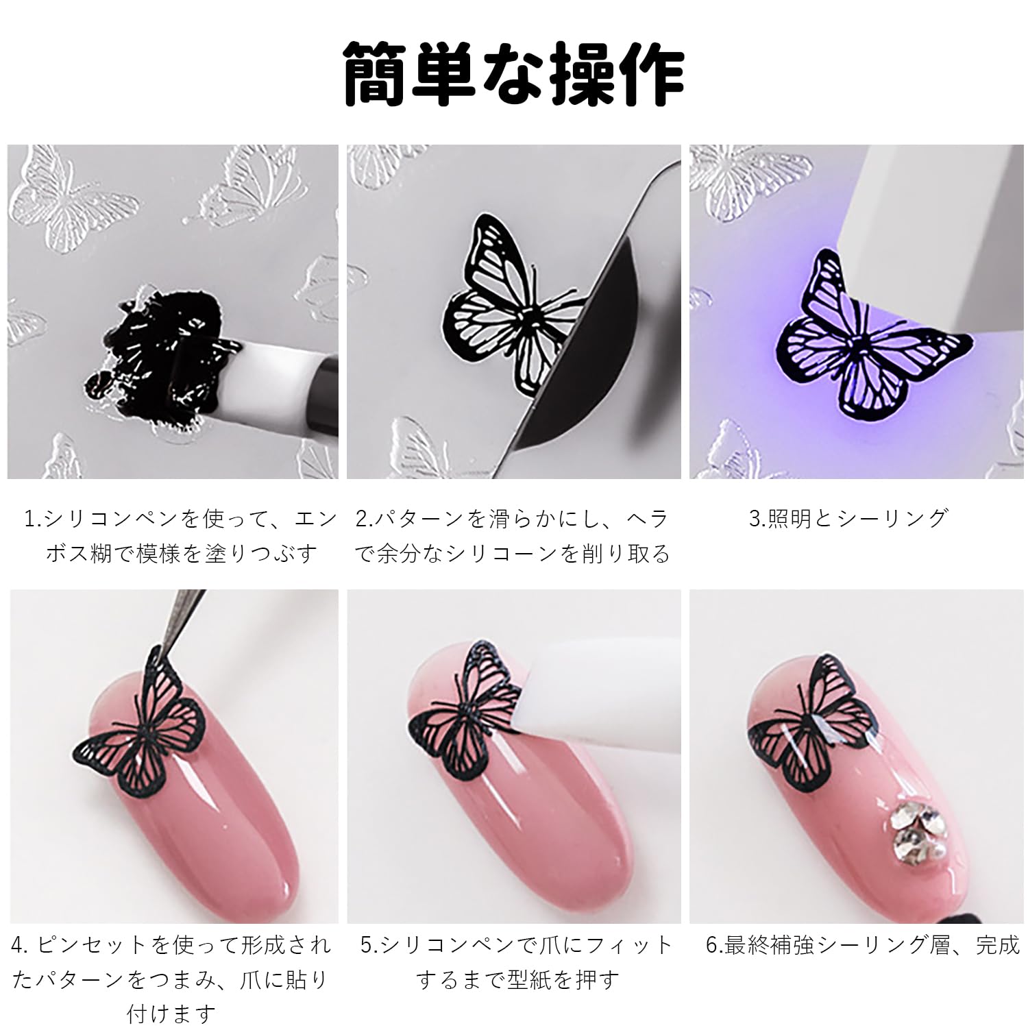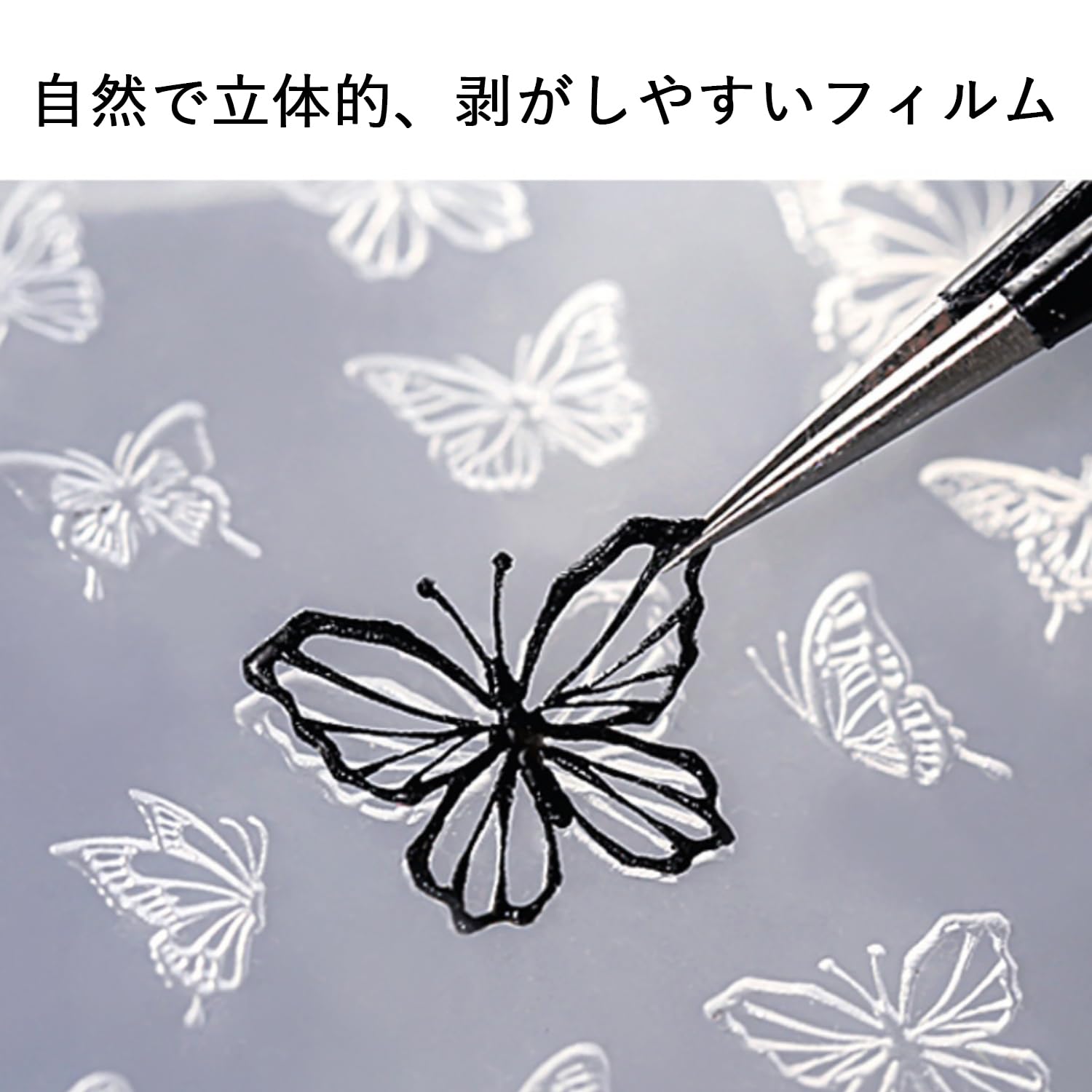 【再利用可能】型は洗いやすく、清潔に保たれ、何度でも使える。ベタつかず、簡単に剥がせるので初心者でも使いやすい。さまざまな蝶のつけ爪やネイルシールを、お好きな色の組み合わせで作ることができます。