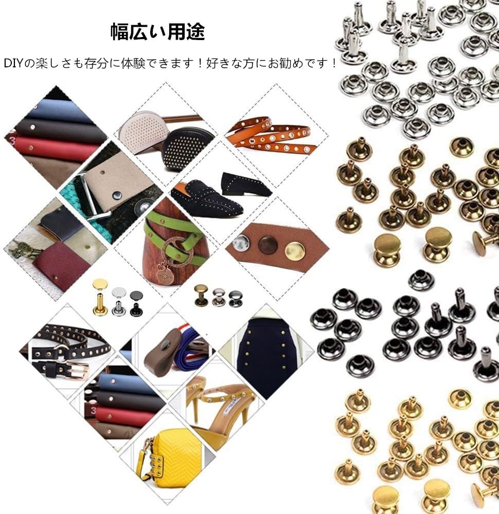 【幅広い用途】鞄、財布、服、キーケース、サンダル、アクセサリー等様々なホックの取付作業に必須の定番セットになります。大活躍な手芸材料セット、素敵なハンドメイド作品の仕上げに大いに役立ち間違いありません。DIY好きな方にお勧めです!